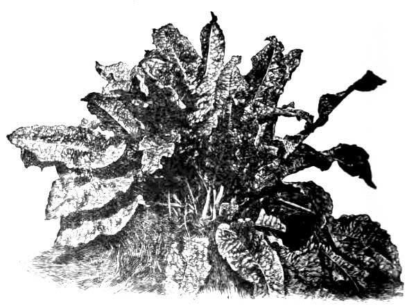 The leaves are broadly oblong in form, toothed, the upper surface rough and the under side densely soft-hairy. The basal or root leaves are borne on long stems, and are from 10 to 20 inches long and 4 to 8 inches wide, while the upper leaves are smaller and stemless or clasping.