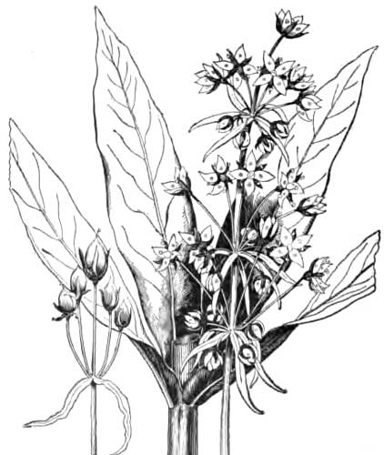 The naked flowering stalk bears three spreading clusters of small, greenish flowers, each cluster consisting of from 12 to 30 flowers produced from May to June, followed later in the season by purplish black roundish berries, about the size of the common elderberries.