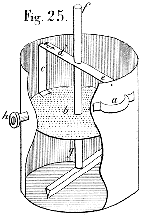 Het bijeenverzamelde honigwater wordt, onder gestadig afschuimen, ingekookt, totdat het zooveel verdikt is, dat een ei daarop drijft; dit behoeft maar even met de punt buiten de vloeistof te komen. Dan laat men het vocht bekoelen, totdat het laauwwarm geworden is, en giet het dan in een vat, dat er geheel mede gevuld moet zijn, opdat de onreinheden, die gedurende de gisting naar boven gevoerd worden, uit het bomgat zouden kunnen vloeijen; het vat moet daarom voortdurend vol gehouden en het bomgat open gelaten worden. Om de gisting spoedig te doen intreden, is het goed wat brandersgist door het zoete water te mengen; 2½ Ned. lood gist, op elke 10 kan der vloeistof, is voldoende. Het vat moet matig warm liggen, het best is eene temperatuur van 55° à 60° F. Na zes à acht weken11 tapt men het [238]heldere vocht op een ander vat over. Den bezonken droes laat men door filtreer-papier loopen, en voegt het verkregen, heldere vocht bij het overige. De gisting blijft nu voortgaan, en opdat het daarbij gevormde koolzuurgas zou kunnen ontwijken, wordt het bomgat slechts los gesloten. Dit vat moet ook voortdurend vol gehouden worden; het best is daartoe voorjarige mede te nemen.
