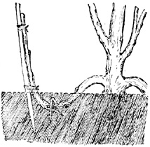 The land on which an orchard is to be planted should have been in cultivation at least two years previous to setting the trees and be in a fine physical condition. Dig the hole broad and deep enough to take in all the roots left after pruning off the bruised ends caused by digging up the tree, and trim back the branches at least two-thirds, making a smooth cut. Set the trunk in the center of the hole, and sift the fine dirt down through the roots, slightly lifting the tree once or twice in order that the fine soil may settle under the roots, making congenial soil for the new roots to run through. Fill in over the roots, gradually firming the soil[15] above with the feet. When the hole is full, firm the soil around the trunk to prevent whipping by the wind, leaving the surface level. If the trees are set in the fall a slight earthing up to the trunk may be beneficial in certain soils, and if set in a dry spring a mulch of straw or grass will benefit them. Two- or 3-year-old trees (usually the latter) are the most desirable for planting in home grounds. Commercial orchards are often planted exclusively with 2-year-olds.