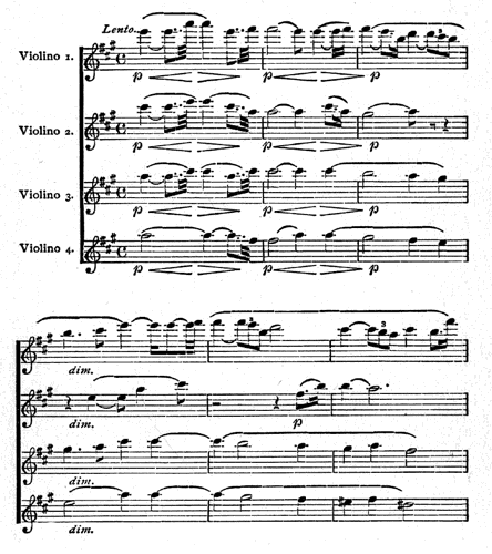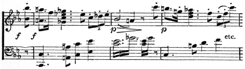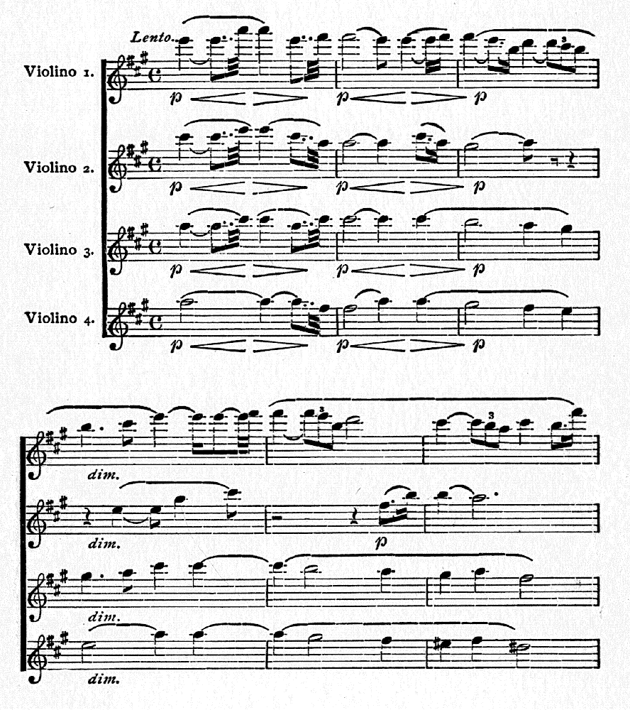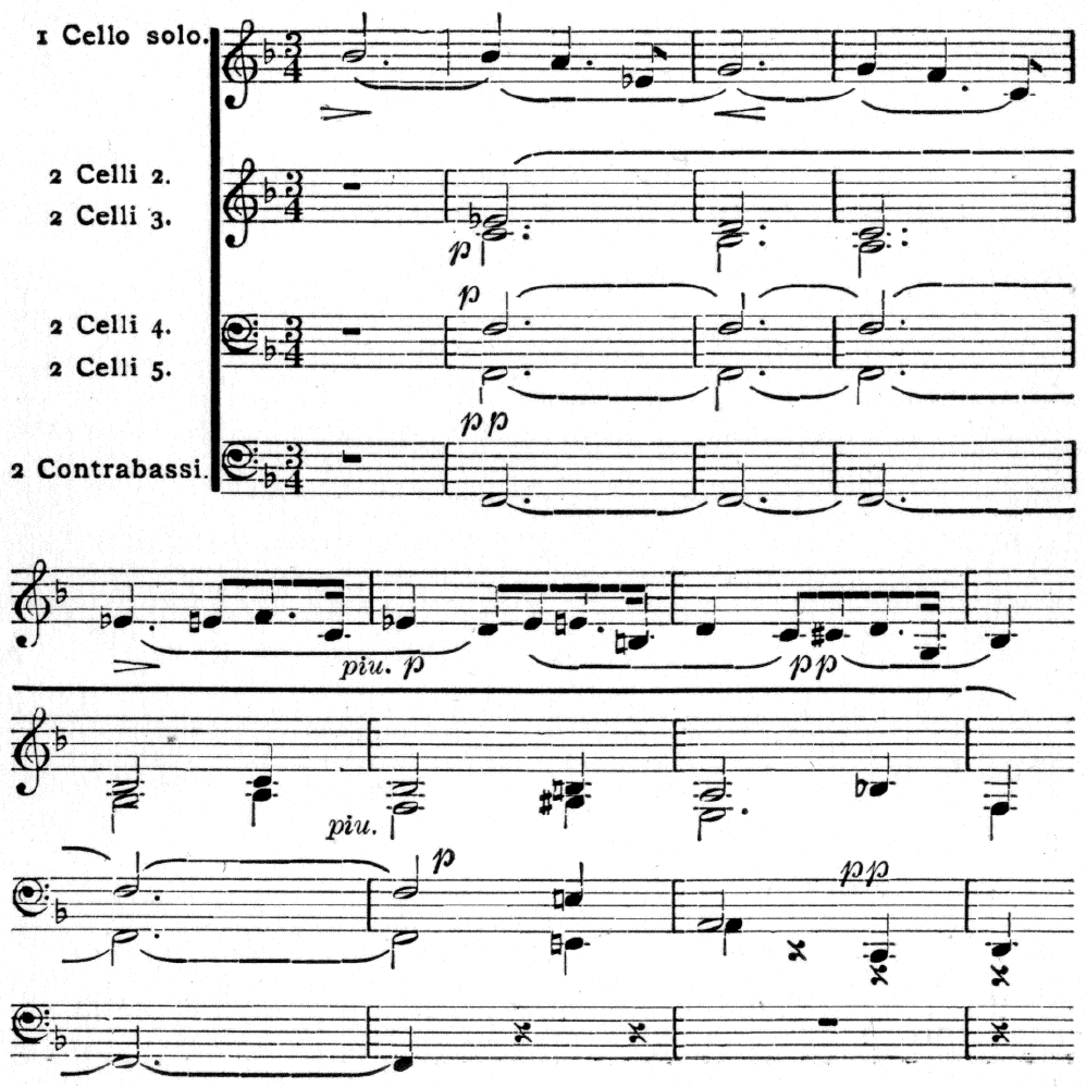 The orchestra an aggregation of instruments that should play as one—Wagner’s employment of orchestral groups illustrated by the Love motive in “Die Walküre” and the Walhalla motive—Division of the orchestra—The violin—Its varied capacity—The musical stage whisper of a hundred violins—The violins in the “Lohengrin” prelude—Modern 16 orchestral virtuosity—The sordine and its use—A pizzicato movement by Tschaikowski—The viola, violoncello and double bass—Dividing the string band—Examples from the scores of Wagner—Anecdote regarding the harp in “Rheingold”—The woodwind—The flute—The oboe in Schubert’s C major symphony—The English horn in “Tristan”—Beethoven’s use of the bassoon in the Fifth and Ninth symphonies—The clarinets in “Tannhäuser,” “Lohengrin,” and “Götterdämmerung”—Brass instruments and various illustrations of their employment—The trumpet in “Fidelio” and “Carmen”—The trombone group in “The Ring of the Nibelung”—The trombones in “The Magic Flute,” in Schubert’s C major symphony, and in the introduction to the third act of “Lohengrin”—The tubas in the Funeral March in “Götterdämmerung”—Richard Strauss’s apotheosis of the horn, and its importance in the Wagner scores—Tympani and cymbals—Mozart’s G minor symphony on twenty-two clarinets—Richard Strauss, on the future development of the orchestra 179