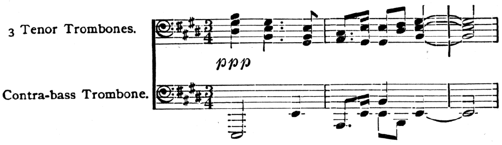 It sometimes is contended that Wagner adopted his system of leading motives because he was not a melodist. This is refuted by the melodies that abound in his earlier works; and, even as I write, I can hear the pupils in a nearby public school singing the melody of the “Pilgrim’s Chorus” from “Tannhäuser.” Moreover, his leading motives themselves are descriptively or soulfully melodious as the requirement may be. They are brief phrases, it is true, but none the less they are melodies. And, in certain episodes in his music-dramas, when he deemed it permissible, he introduced beautiful melodies that are complete in themselves: Siegmund’s “Love Song” and Wotan’s “Farewell,” in “Die Walküre,” the Love Duet at the end of “Siegfried,” the love scene in “Tristan und Isolde,” the Prize Song in “Die Meistersinger.” The eloquence of the brief melodious phrases which we call leading motives, considered by themselves alone and without any reference to the dramatic situation, must be clear to any one who has heard the Funeral March in “Götterdämmerung,” which consists entirely of a series of leading motives 269 that have occurred earlier in the Cycle, yet give this passage an overpowering pathos without equal in absolute music and just as effective whether you know the story of the music-drama and the significance of the motives, or not. If you do know the story and the significance of these musical phrases, you will find that in this Funeral March the whole “Ring of the Nibelung” is being summed up for you, and coming as it does near the end of “Götterdämmerung,” but one scene intervening between it and the final curtain, it gives a wonderful sense of unity to the whole work.