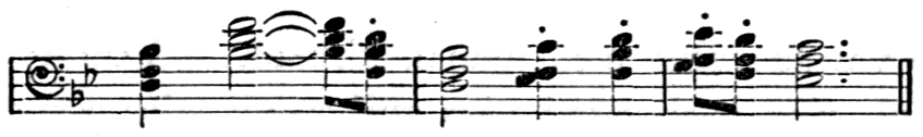 Origin of opera—Peri and the Florentines—Monteverde—Cavalli introduces vocal melody to relieve the monotony of recitative—Aria developed by Alessandro Scarlatti—Characteristics 20 of Italian opera from Scarlatti to Verdi—Gluck’s reforms—German and French opera—“Les Huguenots,” “Faust,” and “Carmen”—Comparative popularity of certain operas here—Far-reaching effects of Wagner’s theories—Their influence on the later Verdi and contemporary Italian composers—Wagner’s music-dramas—A music-drama not an opera—Form wholly original with Wagner—Gave impetus to folk-lore movement—Krehbiel’s “Studies in the Wagnerian Drama”—Wagner and anti-Wagner—Finck’s “Wagner and His Works”—Wagner a melodist—Examples—Unity a distinguishing trait of the music-drama—Wagner’s method illustrated by musical examples—The Curse Motive—The Siegfried, Nibelung, and Tarnhelm motives—Leading motives not mere labels—Their plasticity musically illustrated—The Siegfried horn call developed into the motive of Siegfried, the hero, and into the climax of the “Götterdämmerung” Funeral March—An illustration from “Tristan”—Wagner as a composer of absolute music—His scores the greatest achievement musical history, up to the present time, has to show 260