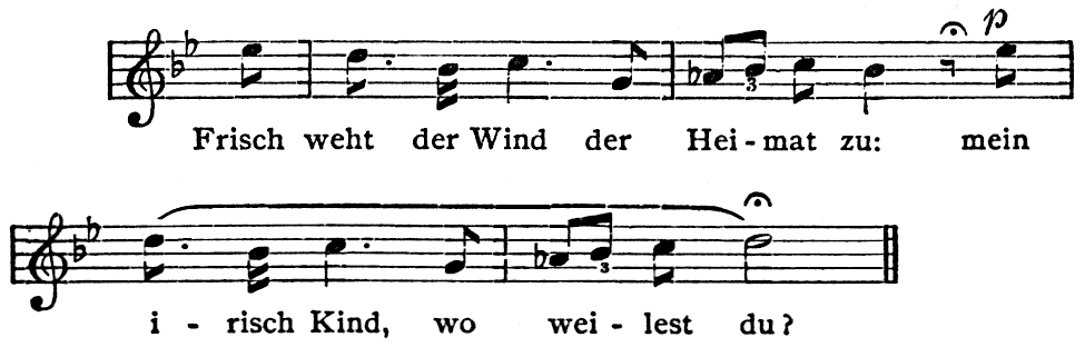 Schubert’s song is almost Wagnerian in its descriptive and dramatic quality. The coaxing voice of the Erlking, the terror of the child, the efforts of the father to allay his boy’s fears, each has its characteristic expression, which yet is different from the narrative portions of the poem, while in the accompaniment the horse gallops along. Schubert was but eighteen years old when he set this ballad of Goethe’s to music; yet there is no more thrilling climax to be found in all song literature than those dissonances which I have mentioned and which with each repeat rise to a higher interval and become each time more shrill with terror. Whoever has heard Lilli Lehmann sing this song should be able to appreciate its real greatness, as Goethe, who had remained utterly indifferent to Schubert’s music, did when the “Erlking” was sung to him by Frau Schroeder-Devrient, to whom he exclaimed: “Thank you a thousand times for this great artistic achievement. When I heard this song before I did not like it at all, but sung in your way it becomes a true picture.”