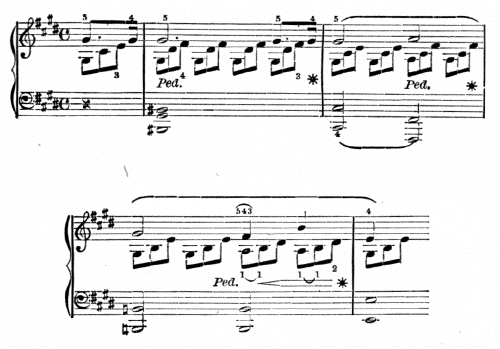 Of course, it is impossible to touch on all the aspects of such a genius as his. In his songs clear and beautiful melody is, as a rule, combined with a descriptive accompaniment. Sometimes the description is given by means of only a few chords, like the preluding ones in “Am Meer.” At other times the description runs through the entire accompaniment, like the waves that flash and dance around the melody of “Auf dem Wasser zu Singen”; the galloping horse in the “Erlking”; 237 the veiled mist that seems to hang over the scenes in the wonderfully dramatic poem, “Die Stadt”; the flutter of the bird in “Hark, Hark, the Lark”; the brook that flows like a leitmotif through the “Maid of the Mill” cycle—these are a few of the examples that with Schubert could be cited by the dozen.