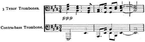 Often, when several characters are participating in a scene, or when the act or influence of one, or the principle for which he stands in the drama, is potent, though he himself is not present, Wagner with rare skill combines several motives, utilizing for this purpose all the resources of counterpoint. Elsewhere I already have described how he has done this in the Magic Fire Scene in “Die Walküre,” and one could add page after page of examples of this kind. I have also spoken of his supreme mastership of instrumentation, through which he gives an endless variety of tone color to his score.