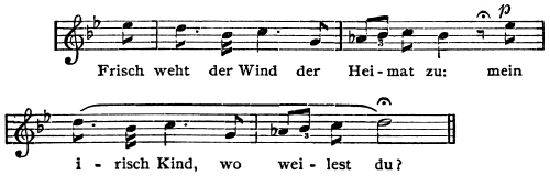 Brahms was a profound thinker in music—not a philosopher, but a reflective poet, whose musicianship, however, was so great that he cared too little for the practical side of his art as compared with the theoretical. If what he wrote looked all right on paper he was indifferent as to whether it sounded right or not; consequently, if he started out with a certain rhythmical figuration or a certain scheme of harmonic progression, he carried it through rigidly to its logical conclusion, utterly oblivious to, or at least utterly regardless of, any tonal blemishes that might result, although by slightly altering his scheme here and there he might have obviated these. This is the reason why some people find passages in his music which to them sound repellant. But those who have not allowed this 243 aspect of Brahms’s work to prejudice them and have familiarized themselves with his music, well know that he is one of the loftiest souls that ever put pen to staff. He never is drastic, never sensational, never superficial; and the climaxes of his songs, as in his other music, are produced not by great outbursts of sound, but by sudden modulations or change of rhythm, which give a wonderful “lift” to voice and accompaniment.