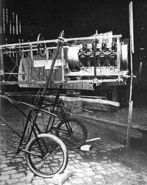 [10] Rappelons incidemment que les principaux essais Turent successivement: 1o le dirigeable d'Henri Giffard (1852), moteur à vapeur; vitesse obtenue: 3 mètres à la seconde; 2o le dirigeable de Dupuy de Lôme, à hélice mise en mouvement par des hommes (1872), vitesse: 2 m. 25 à la seconde: 3o le dirigeable des frères Tissandier (1883), moteur électrique (dynamo Siemens), vitesse: 4 mètres par seconde; 4o Ballon dirigeable La France, des capitaines Renard et Krebs (1884-1885), moteur électrique (dynamo Gramme), vitesse: 6 m. 50 par seconde (La France fit le premier voyage aérien à circuit fermé); 5o le dirigeable Santos-Dumont (1901), moteur à explosion.