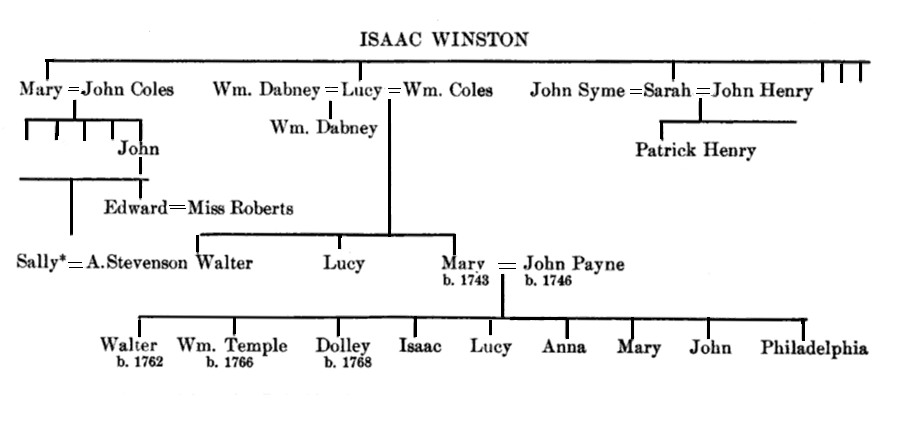 William Coles came later to America from Enniscorthy, Ireland, and married Lucy, the sister of his brother's wife, then the widow of William Dabney, by whom she had one son, William. William and Lucy Winston Coles had three children: Walter; Lucy, who married her cousin Isaac Winston, and Mary, the wife of John Payne, and mother of Dolly Madison.