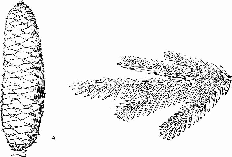 The wood of the Spruce Fir, though light, is even grained, elastic, and durable, and the straightness of its stem makes it very valuable for all purposes where great length and straightness are required, as for the masts of small vessels, ladders, scaffolding, telegraph-poles; as well as for the varied uses the builder finds for its planks. It supplies resin and pitch, and most of the cheaper periodicals now issued largely owe their existence to the Spruce, for its fibres reduced to pulp are made into the paper upon which they are printed. Although its growth during the first few years is rather slow, progress during the next twenty-five years is tolerably rapid, being at the rate of two or three feet per year, if in a favourable situation, and on moist light soil. When grown in a wood the Spruce loses its lower branches early, but when given sufficient "elbow-room," these remain to a good old age, so that from spire to earth the graceful cone of bright green is continuous.