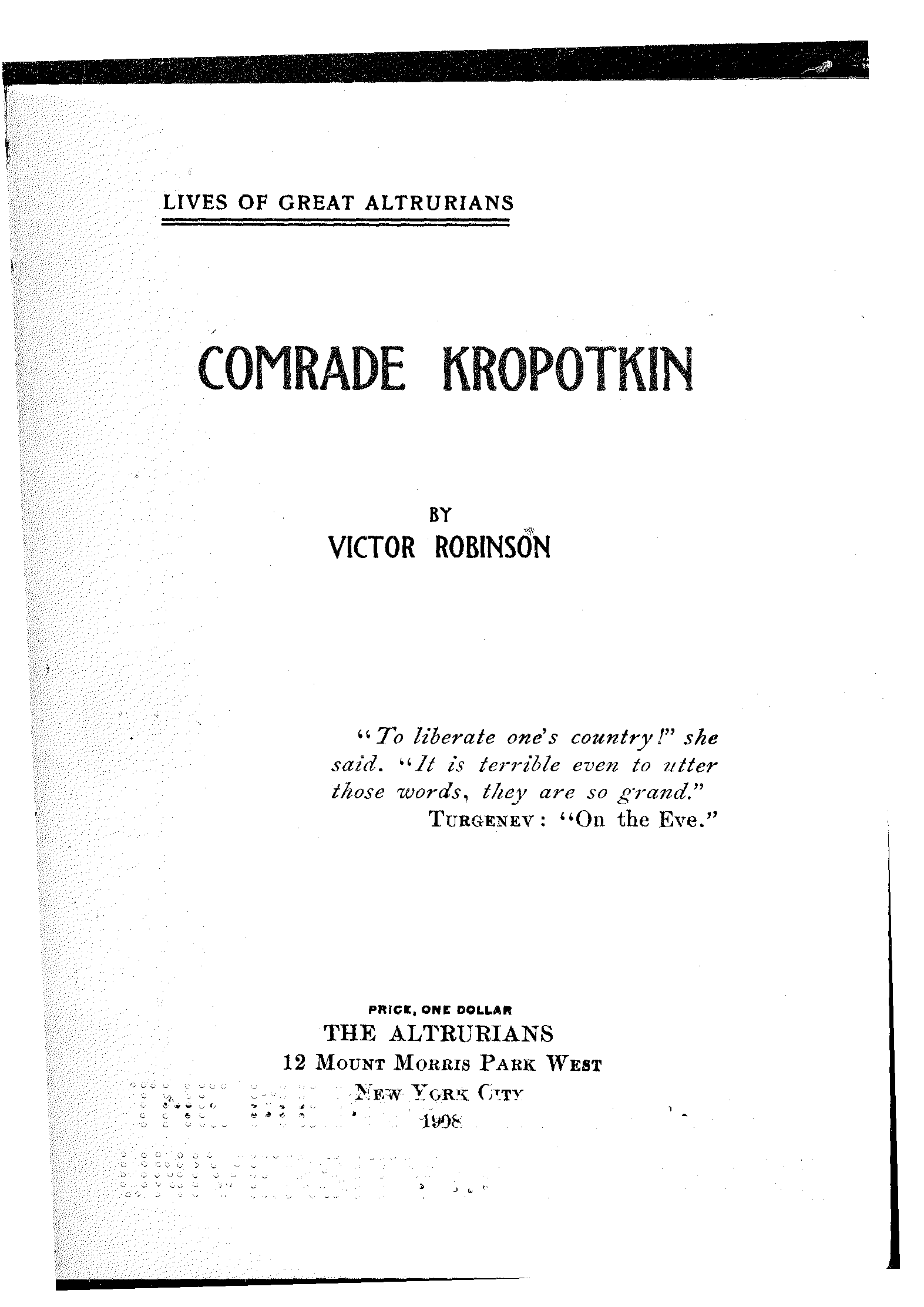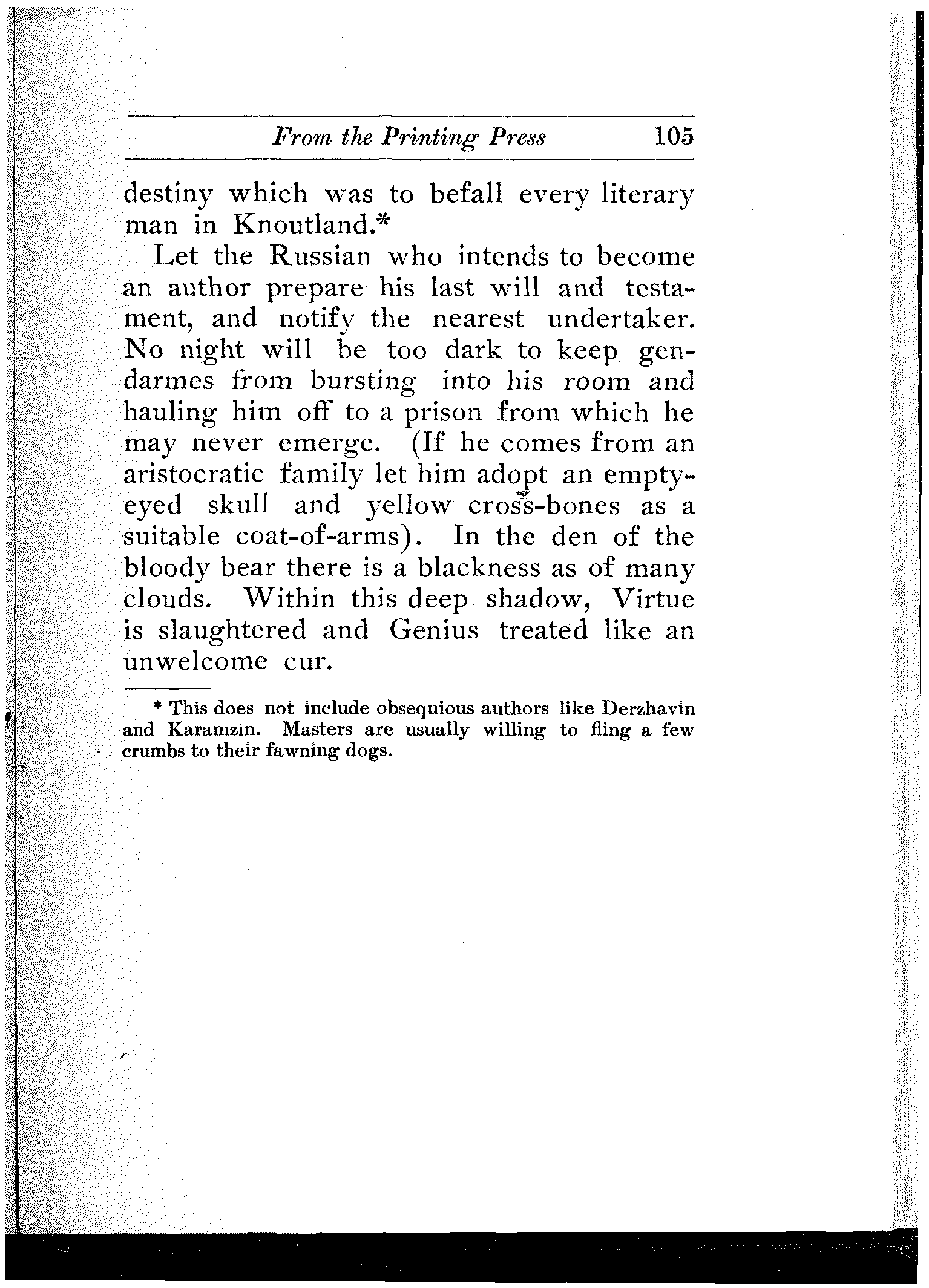 I refrain from any remarks as to the intrinsic value of this book, as it is perhaps not quite proper for a father to criticize, favorably or otherwise, the literary productions of his son. One comment however I would like to make: For one who is utterly unfamiliar with the Russian language, and who has worked alone and unaided, (in the leisure moments left over by strenuous college studies), the author has accomplished a rather noteworthy feat. He has succeeded in imbuing the book with such an atmosphere, in presenting such vivid and faithful glimpses of Russian life and literature, and exhibiting such wide and varied knowledge of the subject, that even a Russian writer would not be ashamed to have his name appear on the title-page of this volume.