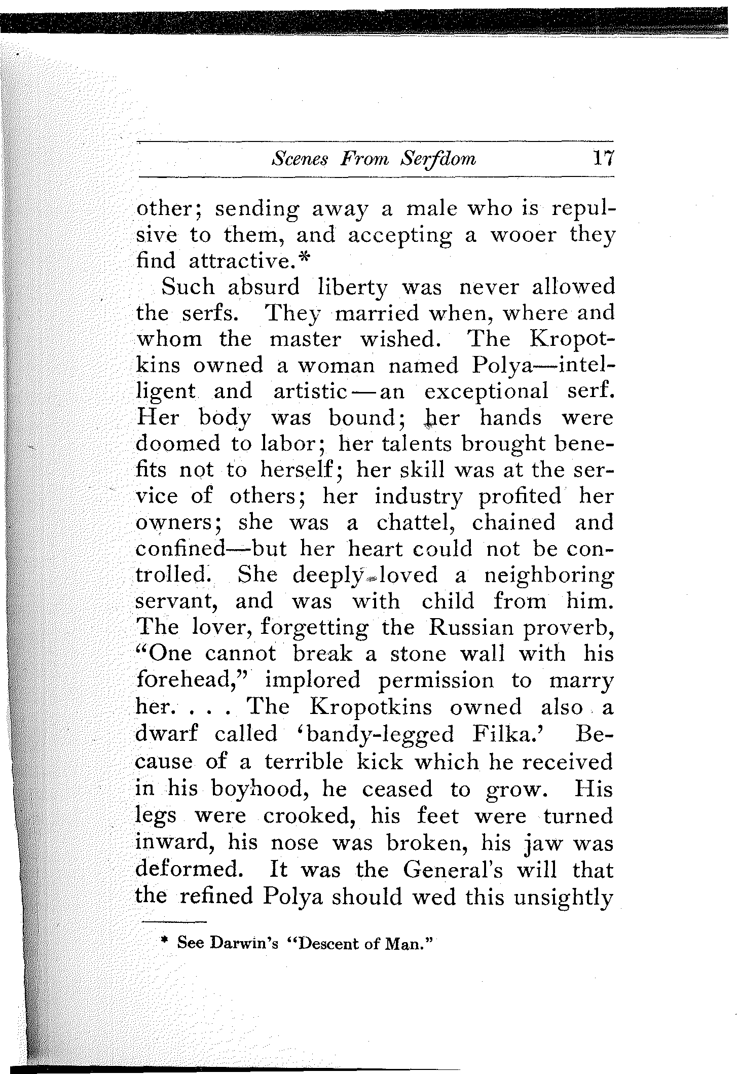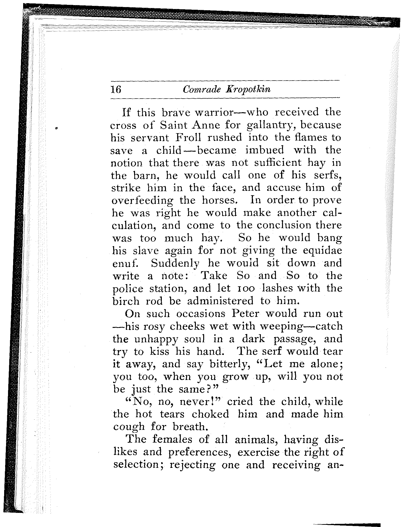 If this brave warrior—who received the cross of Saint Anne for gallantry, because his servant Froll rushed into the flames to save a child—became imbued with the notion that there was not sufficient hay in the barn, he would call one of his serfs, strike him in the face, and accuse him of overfeeding the horses. In order to prove he was right he would make another calculation, and come to the conclusion there was too much hay. So he would bang his slave again for not giving the equidae enuf. Suddenly he would sit down and write a note: Take So and So to the police station, and let 100 lashes with the birch rod be administered to him.