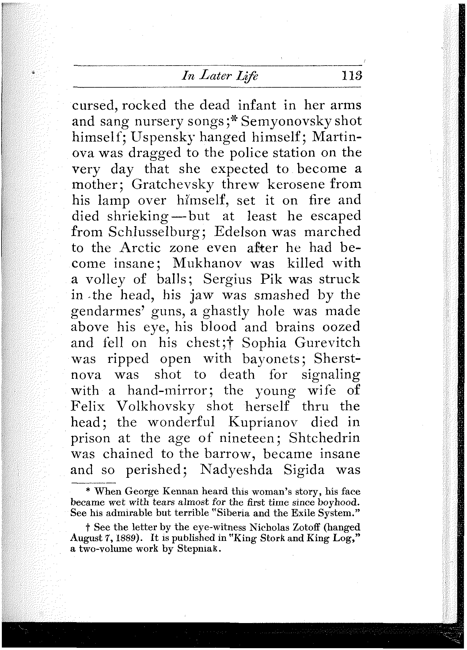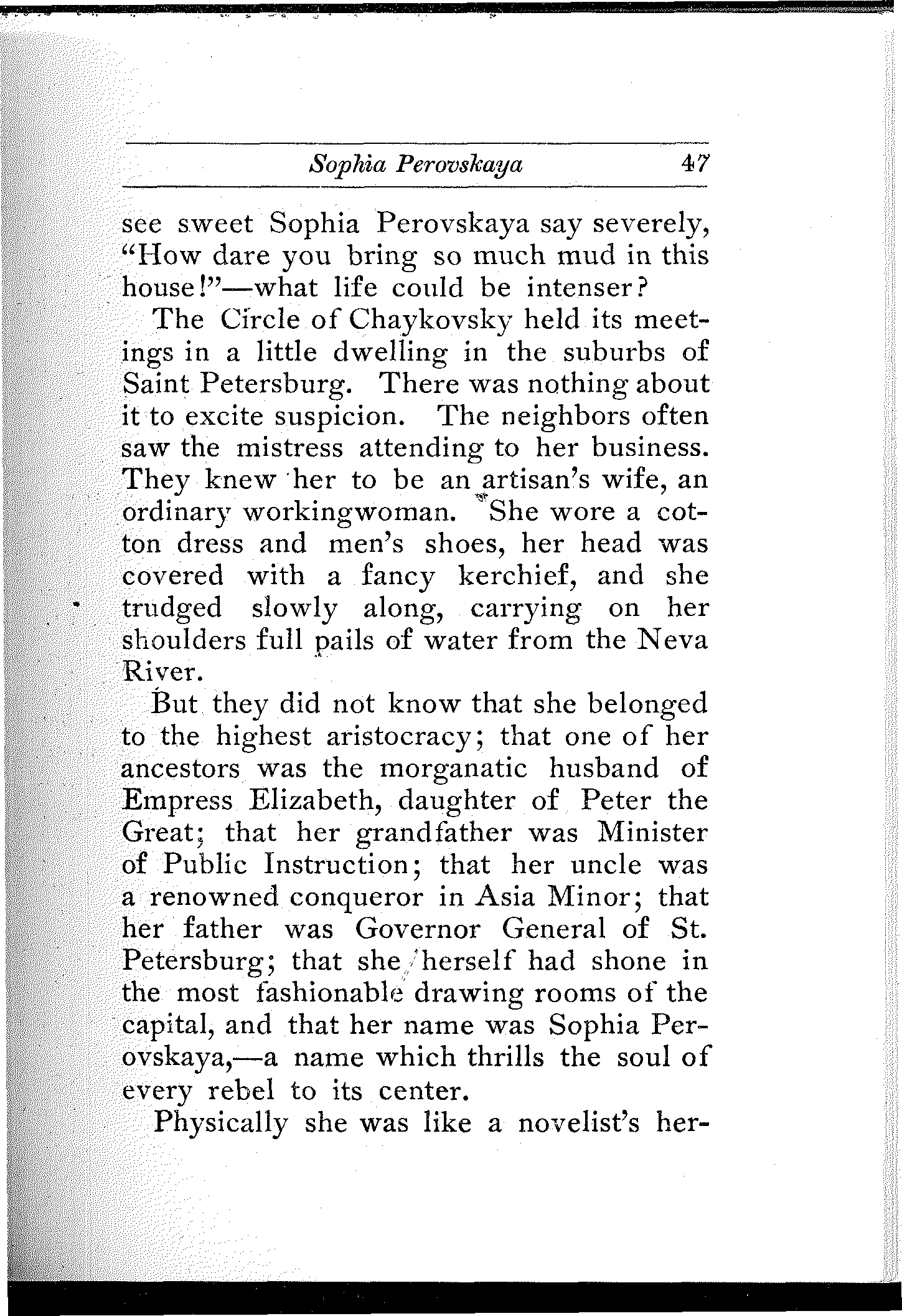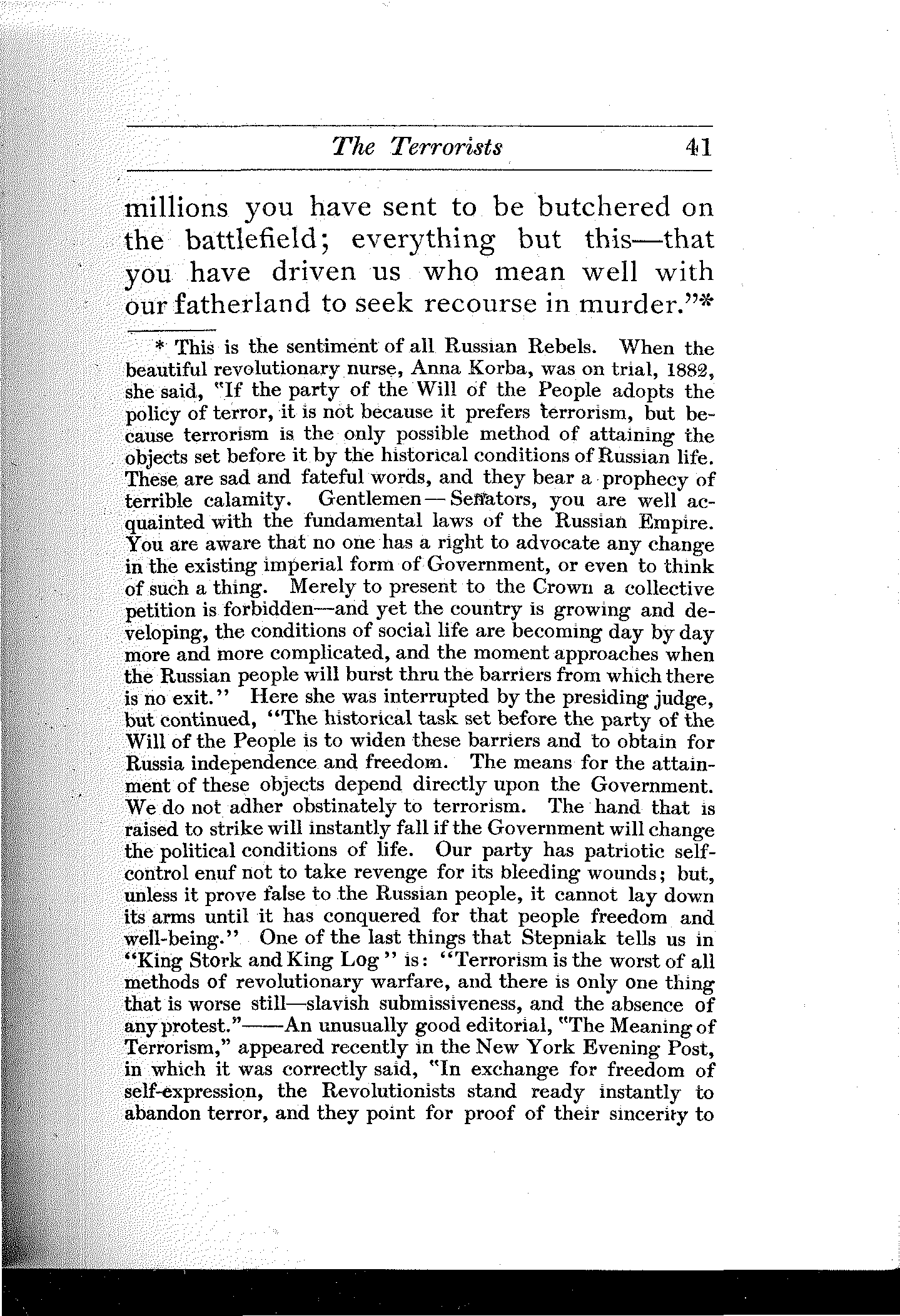 A wonderful and terrible thing is happening in the largest empire on earth; a downtrodden people is engaged in a death-grapple with its merciless rulers; and never were masters so inhuman, and never were people so heroic. In comparison with this titanic struggle the French Revolution itself sinks into insignificance. But what do we know about it? And what do we care? Russia is far away.... Once in a while the report of a particularly atrocious massacre, or a particularly cruel torture inflicted upon a young girl revolutionist will shock our sensibilities, will cause a pang in our hearts, will perhaps make our hair stand on end,—but in a day or two we forget all about it. We are so busy!