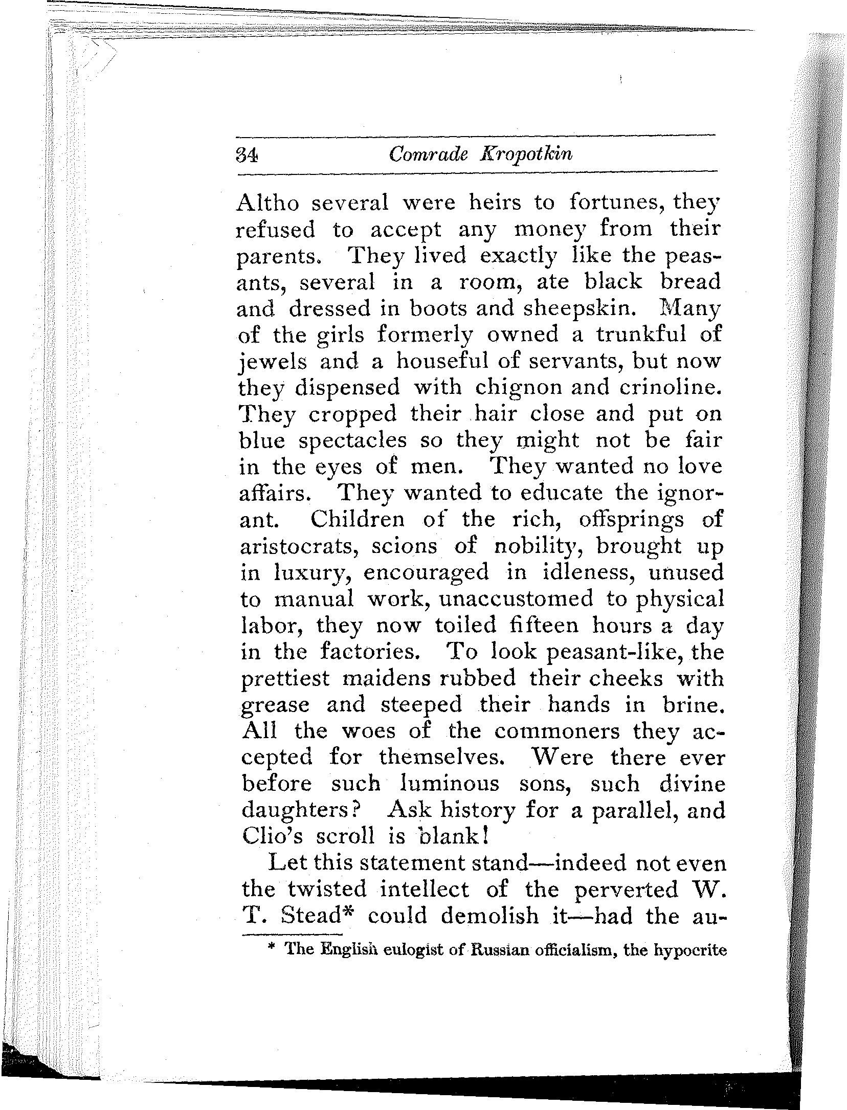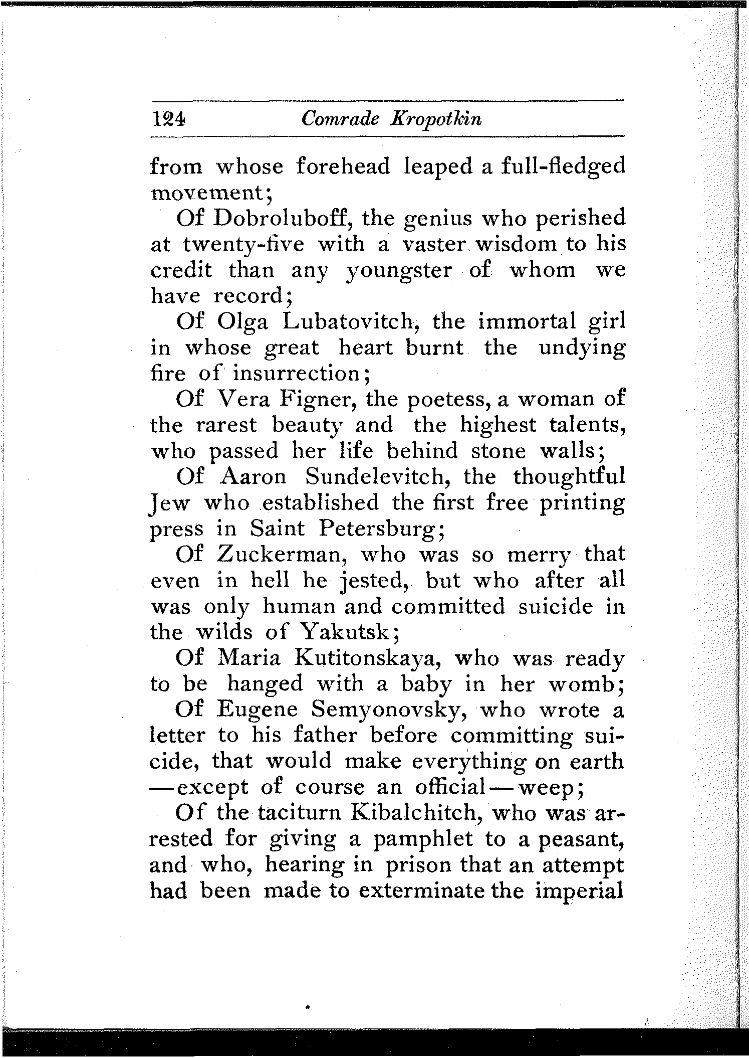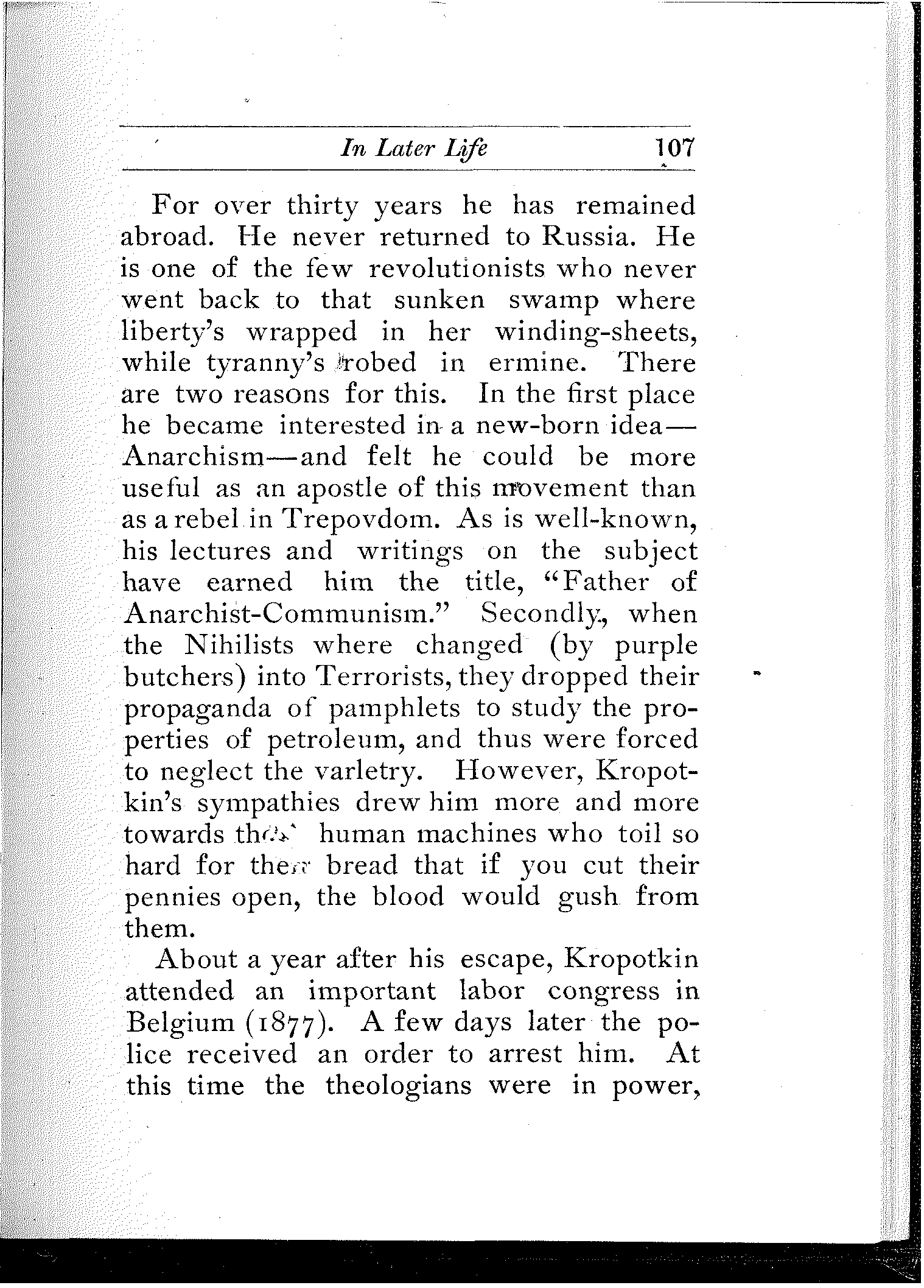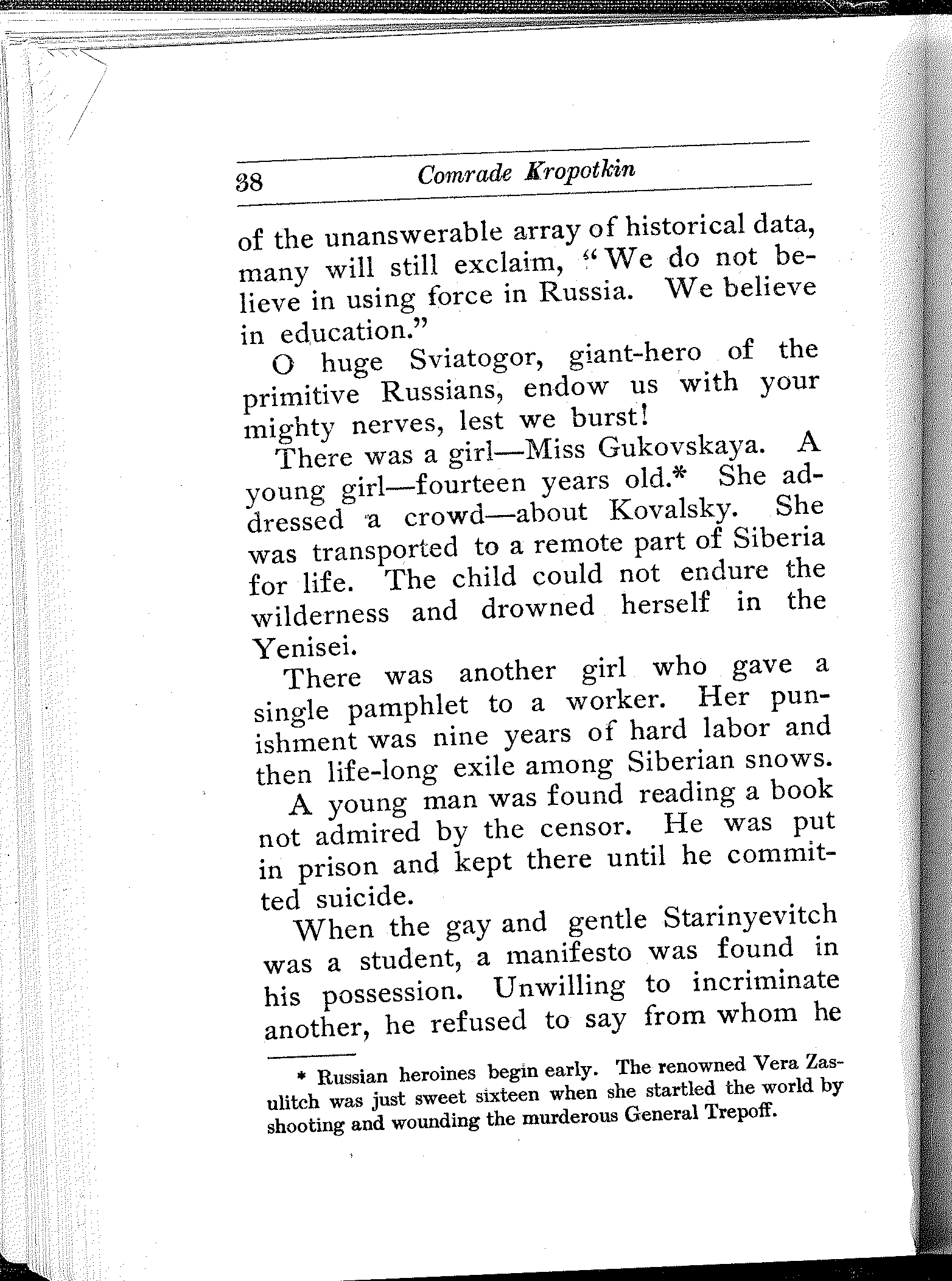 A remarkable commentary on the conditions in Russia is the fact that he who studies them carefully and thoroly, be he the gentlest and sweetest youth who would not harm a fly or tread on a worm, becomes saturated with the conviction that in Russia, the rebel's bomb and pistol and dagger are not only legitimate and necessary, but even noble weapons of defense and offense.