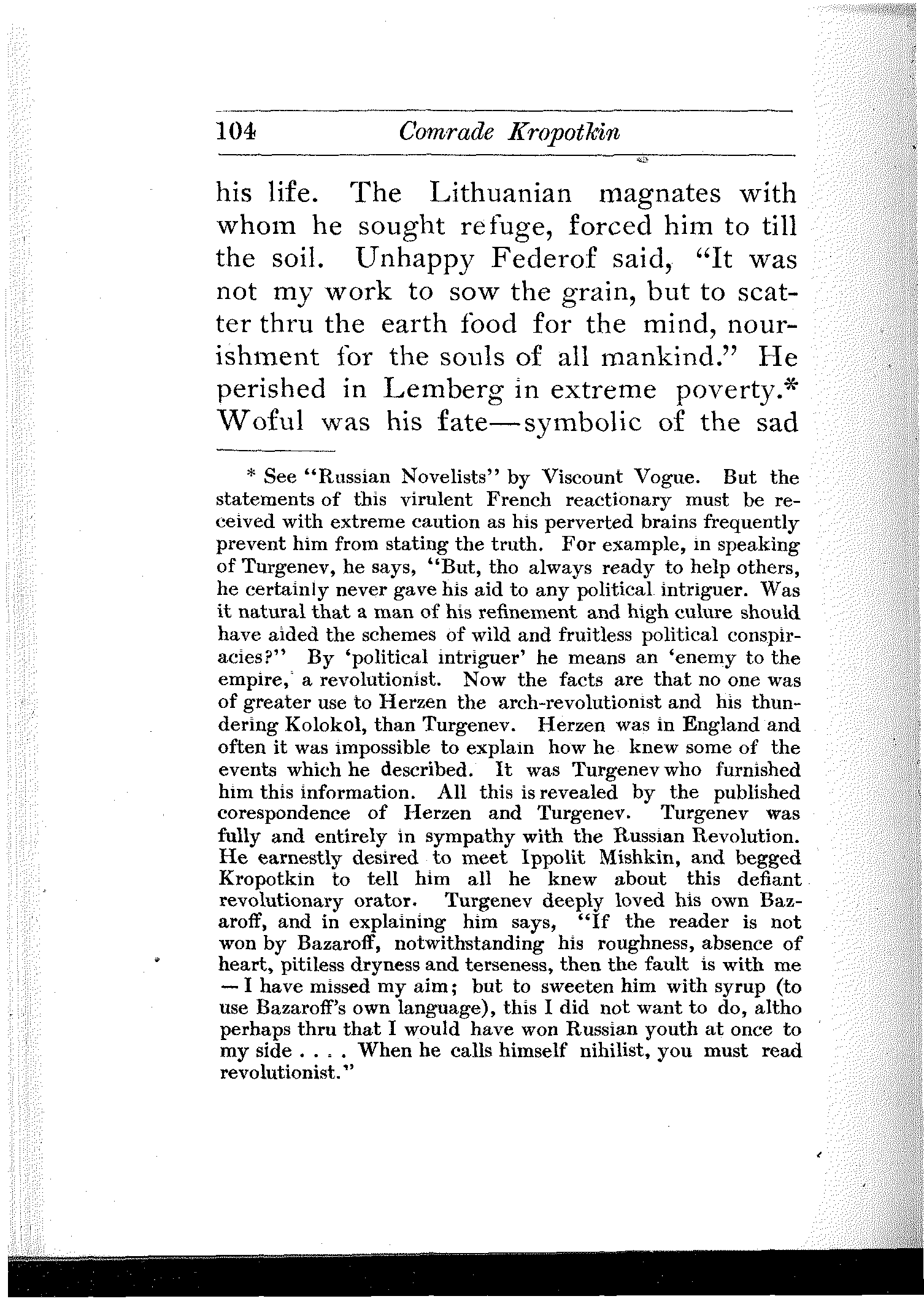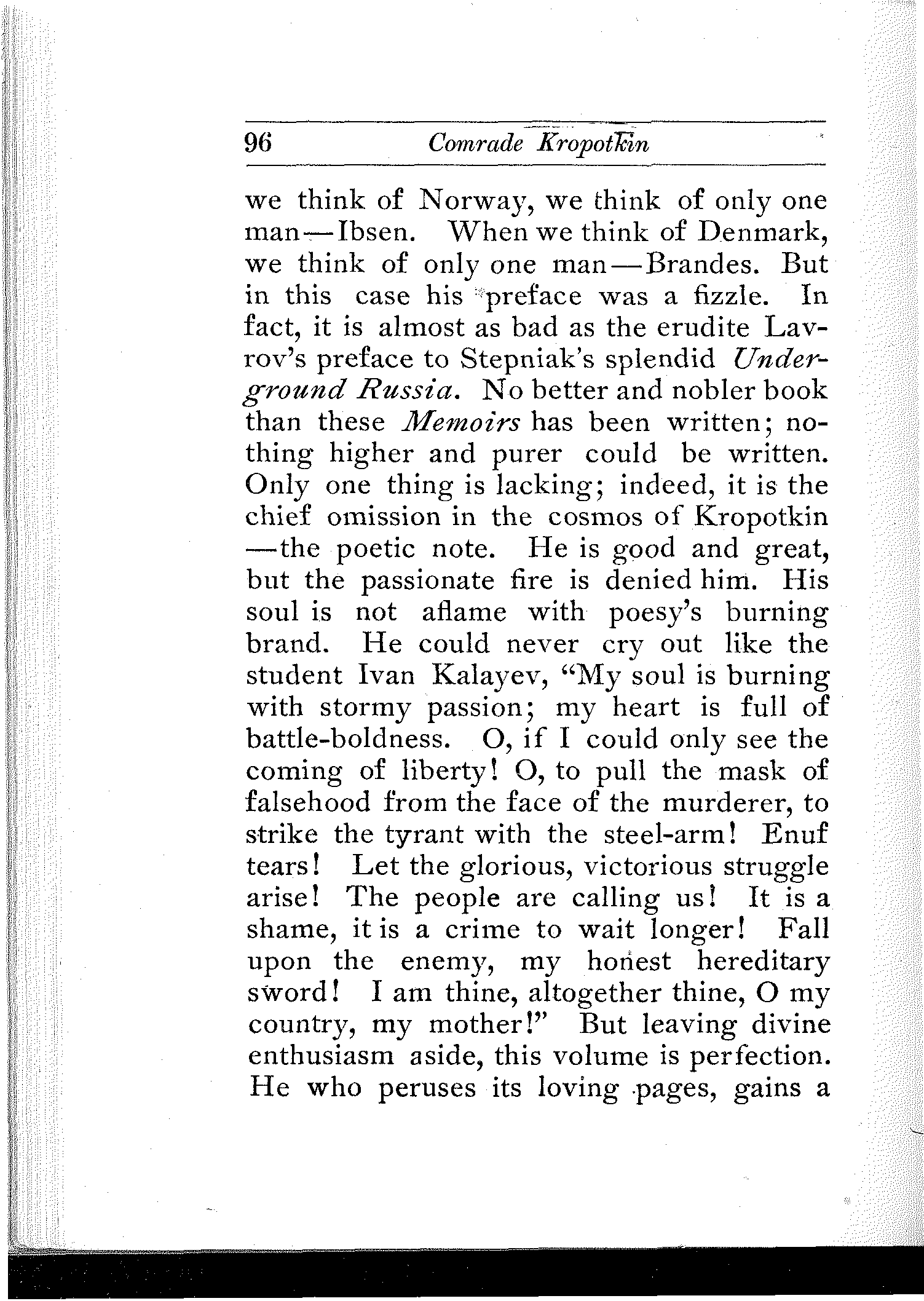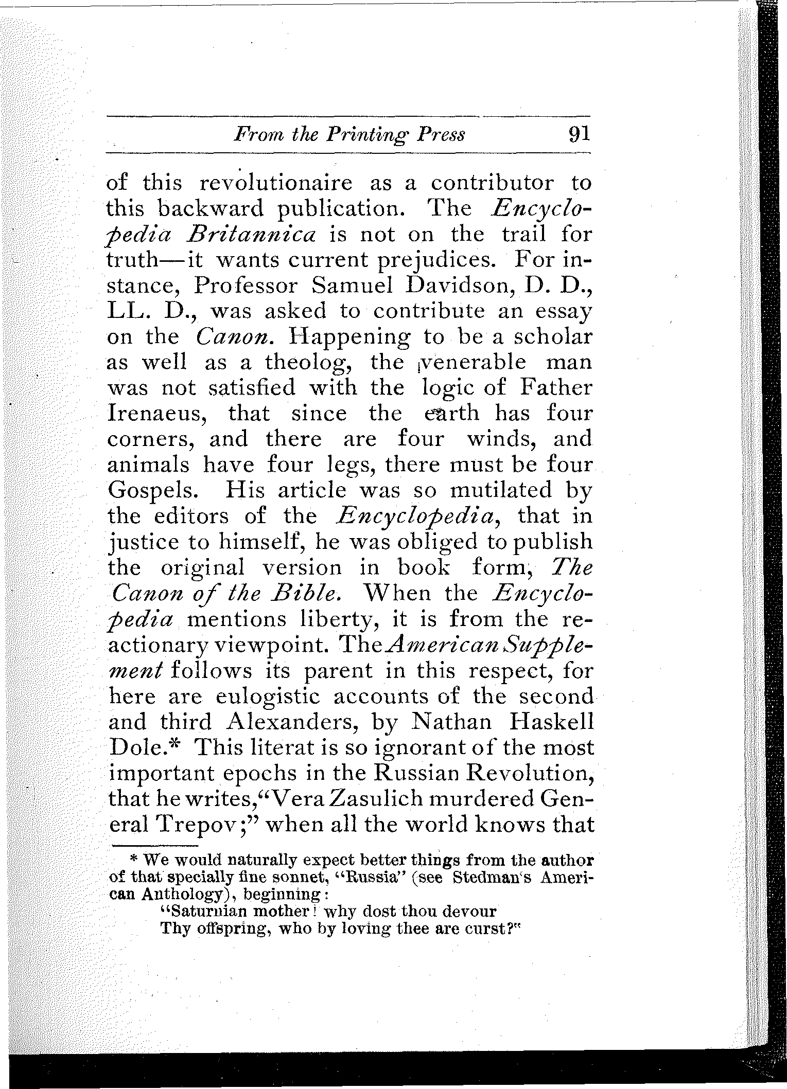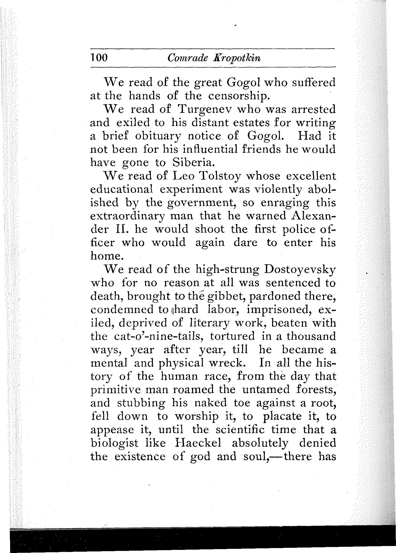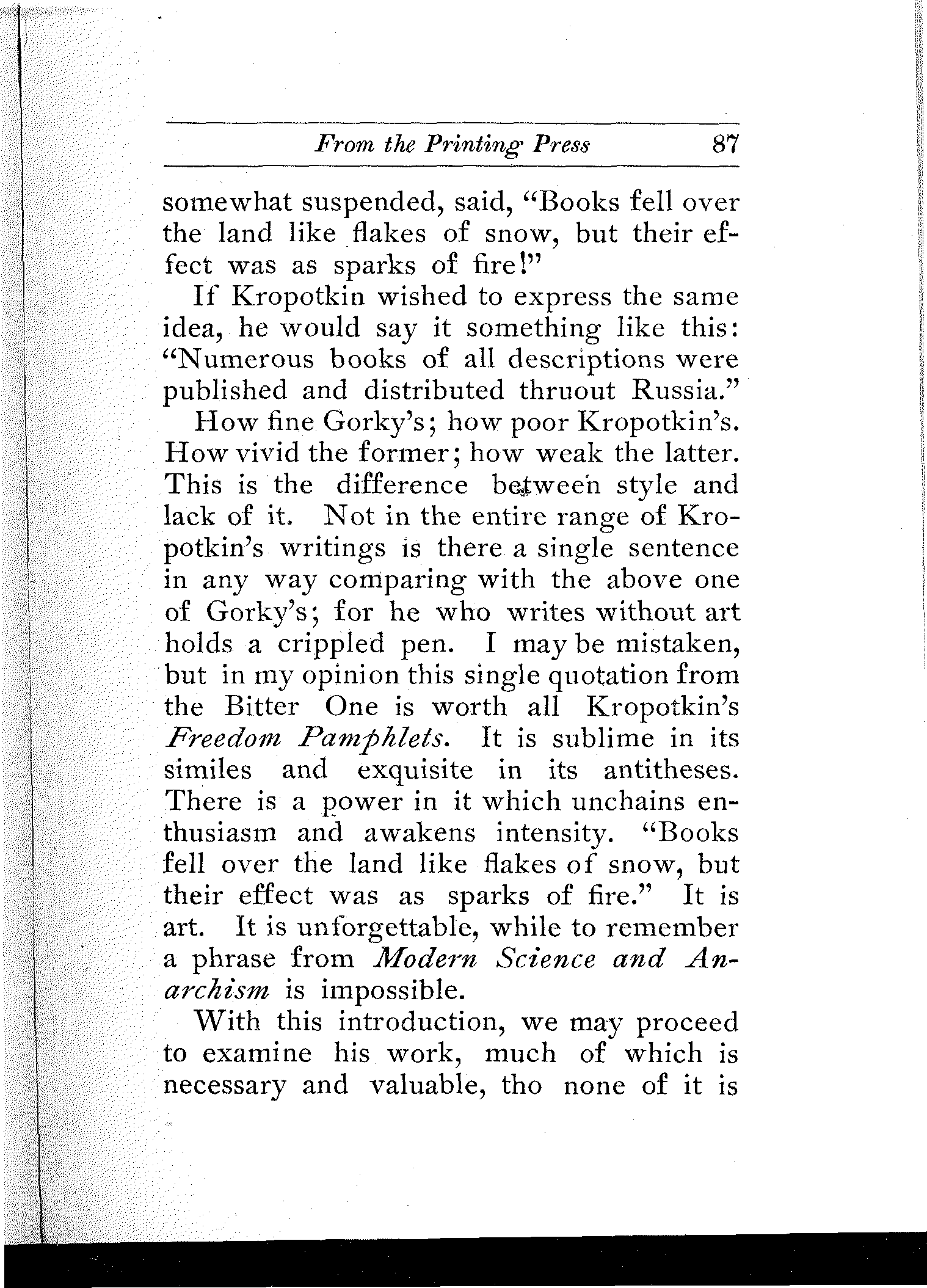 A remarkable commentary on the conditions in Russia is the fact that he who studies them carefully and thoroly, be he the gentlest and sweetest youth who would not harm a fly or tread on a worm, becomes saturated with the conviction that in Russia, the rebel's bomb and pistol and dagger are not only legitimate and necessary, but even noble weapons of defense and offense.
