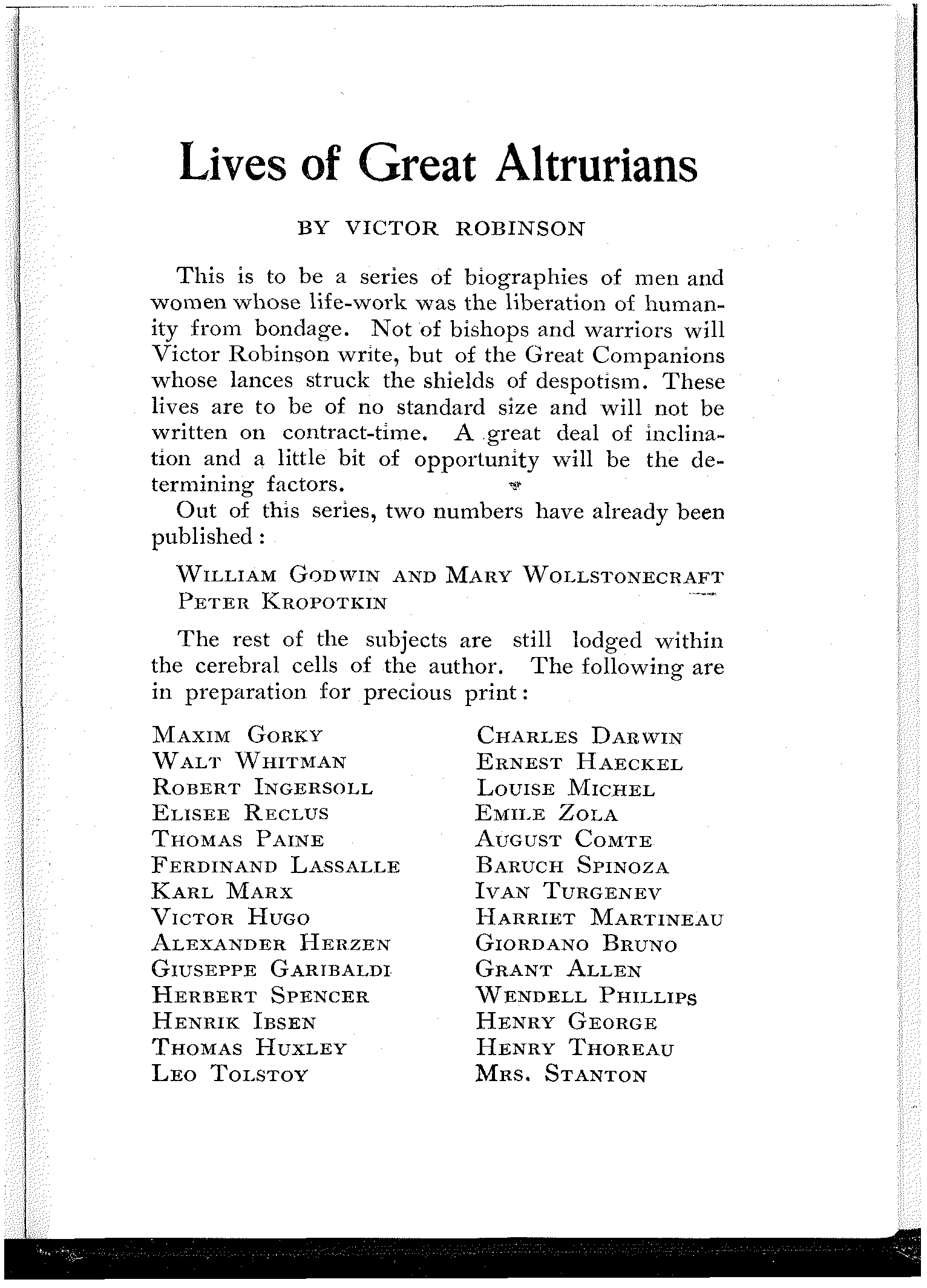 The story of William Godwin and Mary Wollstonecraft is now in pamphlet form, fresh from the gifted pen of Victor Robinson. It is a story of two great souls charmingly told by another.