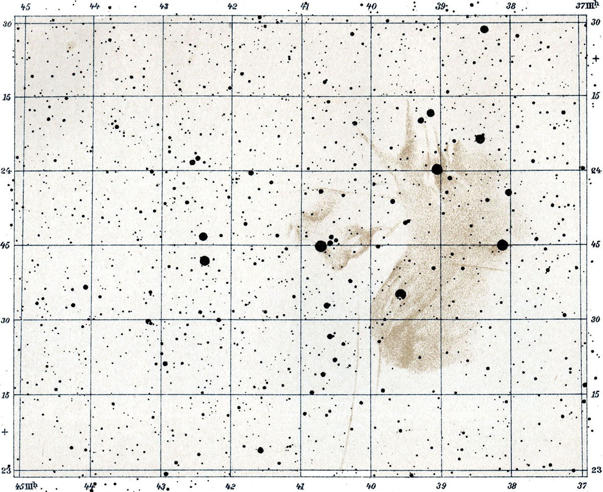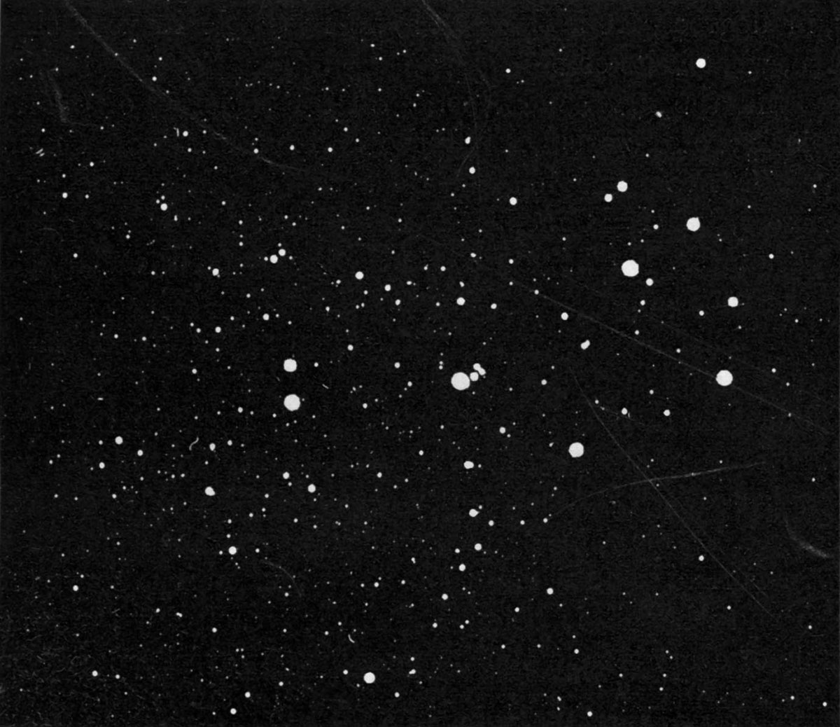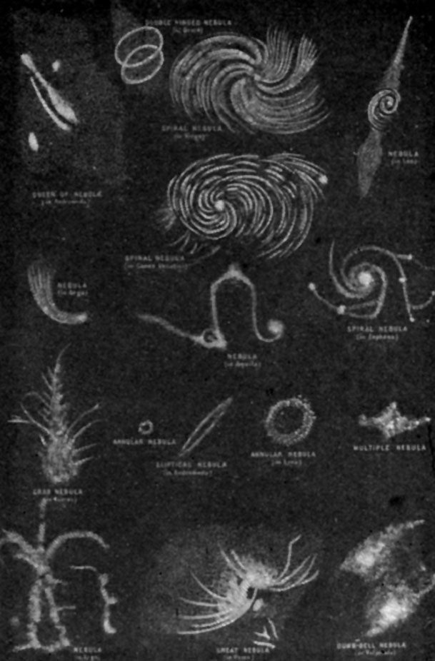 245. Nebulæ.—The nebular hypothesis of Laplace has inclined astronomers to look upon nebulæ in general as material destined to be worked up into stars, but which is now in a very crude and undeveloped stage. Their great bulk and small density seem also to indicate that gravitation has not yet produced in them results at all comparable with what we see in sun and stars. But even among nebulæ there are to be found very different stages of development. The irregular nebula, shapeless and void like that of Orion; the spiral, ring, and planetary nebulæ and the star cluster, clearly differ in amount of progress toward their final goal. But it is by no means sure that these several types are different stages in one line of development; for example, the primitive nebula which grows into a spiral may never become a ring or planetary nebula, and vice versa. So too there is no reason to suppose that a star cluster will ever break up into isolated stars such as those whose relation to each other is shown in Fig. 122.