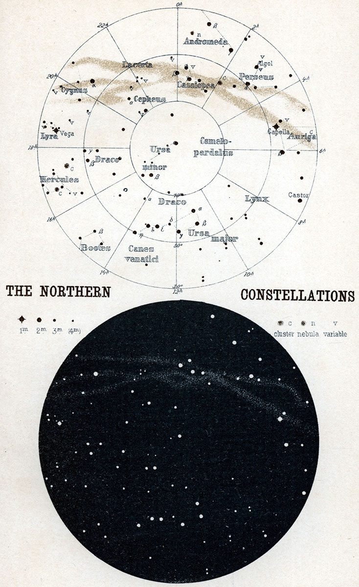8. The stars.—From the very beginning of his study in astronomy, and as frequently as possible, the student should practice watching the stars by night, to become acquainted with the constellations and their movements. As an introduction to this study he may face toward the north, and compare the stars which he sees in that part of the sky with the map of the northern heavens, given on Plate I, opposite page 124. Turn the map around, upside down if necessary, until the stars upon it match the brighter ones in the sky. Note how the stars are grouped in such conspicuous constellations as the Big Dipper (Ursa Major), the Little Dipper (Ursa Minor), and Cassiopeia. These three constellations should be learned so that they can be recognized at any time.