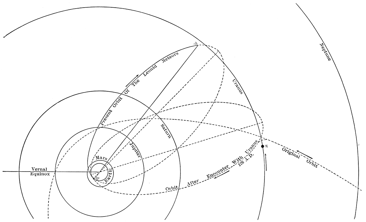 247. Stability of the universe.—It was considered a great achievement in the mathematical astronomy of a century ago when Laplace showed that the mutual attractions of sun and planets might indeed produce endless perturbations in the motions and positions of these bodies, but could never bring about collisions among them or greatly alter their existing orbits. But in the proof of this great theorem two influences were neglected, either of which is fatal to its validity. One of these—tidal friction—as we have already seen, tends to wreck the systems of satellites, and the same effect must be produced upon the planets by any other influence which tends to impede their orbital motion. It is the inertia of the planet in its forward movement that balances the sun's attraction, and any diminution of the planet's velocity will give this attraction the upper hand and must ultimately precipitate the planet into the sun. The meteoric matter with which the earth comes ceaselessly into collision must have just this influence, although its effects are very small, and something of the same kind may come from the medium which transmits radiant energy through the interstellar spaces.