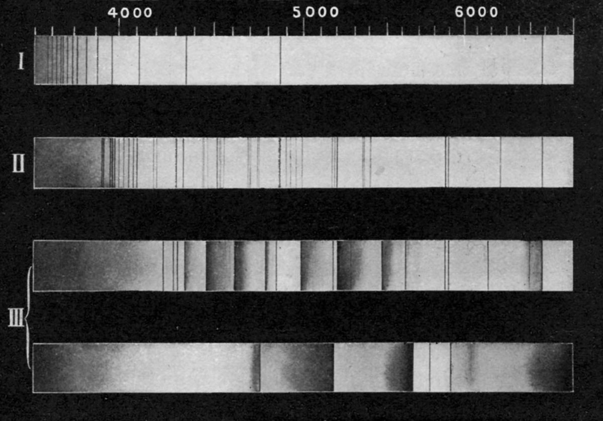 243. Stellar spectra.—Thus the types of stellar spectra shown in Fig. 151 are supposed to illustrate successive stages in the development of an average star. Type I corresponds to the period in which its temperature is near the maximum; Type II belongs to a later stage in which the temperature has commenced to fall; and Type III to the period immediately preceding extinction.