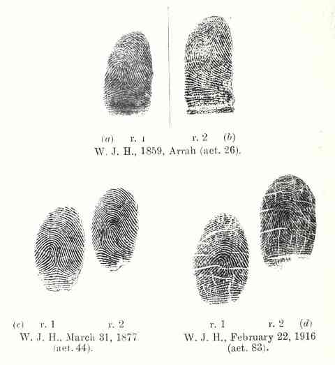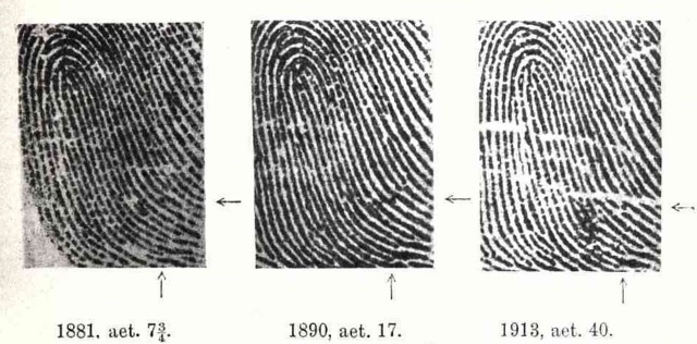 The conviction of the unchanging character of finger-patterns had, of course, grown on me only by degrees, as the evidence of time accumulated. Among my friends, from Nuddea days onwards, I often took second impressions, invariably drawing attention to their identity with the former ones. I never came upon any sign of change, bar accident. But such comparisons were generally limited to intervals of no more than two or three years, owing to the frequent changes of residence incidental to Indian service. As time went on it was chiefly the incessant evidence of my own ten fingers, and of my whole hand, which wrought in me the overwhelming conviction that the lines on the skin persisted indefinitely.