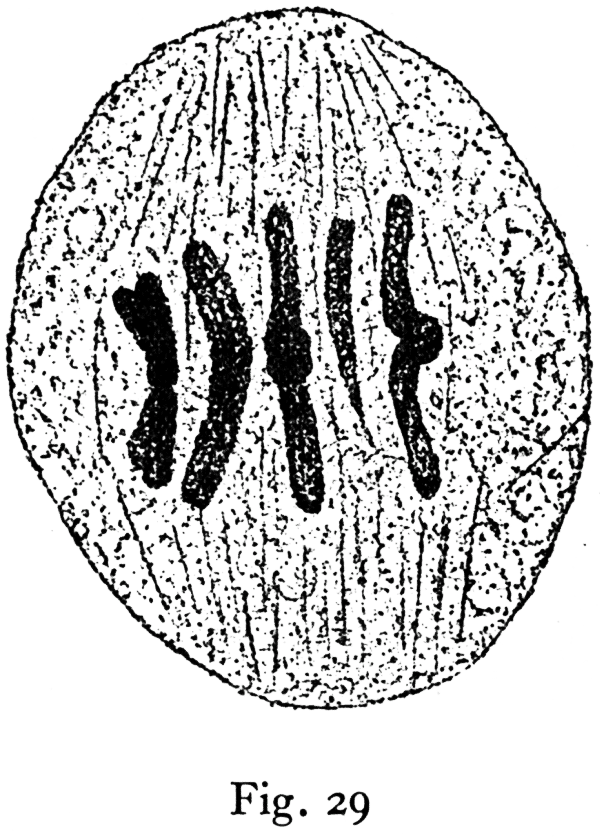 Fig. 29, which illustrates a stage in the division of a nucleus, was drawn with black crayon on a rough-grained piece of Whatman's water-colour paper. The cytologist will, doubtless, criticize its coarseness, but it may be mentioned that the roughest paper at hand was designedly employed in order to illustrate the point raised. That a finer grained paper will give more delicate results is shewn by Fig. 30, which is a reproduction of a drawing, kindly lent by Dr. W. G. Ridewood, made with ordinary lead pencil on grained Bristol board. Its delicacy is obvious, and at first sight it could easily be mistaken for a lithograph.*