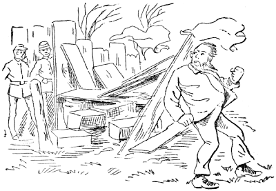 The writer of this was Orderly Sergeant of Company B a part of 1861-2. And certain characters of the Company considered it legal to plunder this much abused official’s pipes, tobacco, and even whiskey was deemed free, whenever or wherever found. The writer suffered many a loss in this line. One especially, who bored him unceasingly for a chance to smoke a very large pipe, holding a quarter pound of tobacco. I will call him “Croxton,” “Jack,” for short. [Pg 33] One morning I sat in my tent making morning report. I had filled this big pipe, and laid it on the desk in front of me, expecting “Jack” to call for a smoke. He came in due time, and asked if he might smoke my big pipe? I told him I had just filled it for my own use. Well, he said, I was busy then, and could smoke after he got through. He always had a story to tell me. He sat with his legs hanging inside the doorway, (the shanty was built of logs). I passed him the pipe; he commenced smoking, and telling me a yarn. Soon the pipe exploded, his heels went up, and he over backwards. He arose and said, “you think you are damned smart.” He asked for no more smoke.