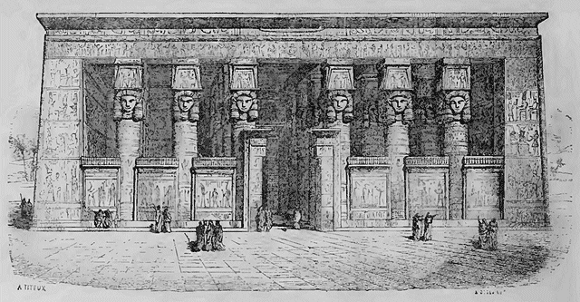 Revenons maintenant à Denderah (Tentyra), dont l'imposante façade est tournée vers le fleuve. Ce célèbre temple, construit en grès, est remarquable par sa belle conservation.--Il fut commencé par Cléopâtre et Ptolemée Césarion, son fils, et continué par tous les empereurs jusqu'à Adrien et Antonin le Pieux. Il est malheureusement enterré dans les décombres. La gravure ci-dessus le montre tel qu'il devait être à l'époque de sa plus grande splendeur. Les vingt-quatre colonnes, en partie enterrées, de ce magnifique portique ou pronaos, sont couvertes, ainsi que les murs qui les entourent, de sculptures peintes représentant des souverains faisant des offrandes aux divinités; le plafond est orné du fameux zodiaque rectangulaire; sur les quatre faces du chapiteau sont les têtes d'Isis au gracieux sourire et aux oreilles de vache; ces têtes, qui toutes ont été martelées probablement par les chrétiens lors du christianisme, ou par les musulmans iconoclastes, soutiennent des petits temples supportant les solives et les plafonds, dans lesquels sont sculptés ses épervier» déployant leurs ailes et portant des harpies, haches d'armes des Pharaons, et où l'on retrouve des femmes nues et allongées, qui, chez les anciens, étaient l'emblème de la voûte céleste.