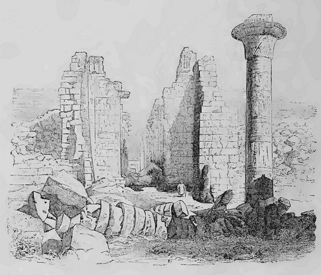 Au centre de la grande cour, qui a une seconde entrée latérale au sud, il y avait une avenue de douze colonnes aujourd'hui renversées; une seule, encore debout, a échappé au bouleversement général; il semble que les dévastateurs et le temps ne l'aient épargnée que pour témoigner de sa magnificence passée, et rendre plus pénible encore le désordre qui l'entoure. A droite de cette culmine, surgit, des décombres, un reste de figure colossale en granit, qui représentait Rhamsès III (Sesostris). Cette figure et son pendant, aujourd'hui détruits ou enlevés, précédaient un vestibule entre deux pylônes tout bouleversés, dans les ruines desquels on trouve des hiéroglyphes de grande dimension avec des cartouches, prénom de Binothris (Skhan), et d'Amon Touonkh ou d'Amon-Tough, auteurs de grands monuments antérieurs à ces pylônes et à l'invasion des pasteurs, c'est-à-dire à 2300 ans environ avant Jésus-Christ.