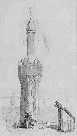Le minaret que représente la planche ci-jointe est un des plus beaux minarets d'Alexandrie. La nuit, quand les étoiles brillent d'une splendeur sans égale, on entend au milieu du silence les muezzins desservants, qui, du haut des minarets, chantent ces paroles solennelles: «Vrais croyants, qui pensez au salut, la prière est préférable au sommeil; réveillez-vous, louez Dieu; il n'y a qu'un Dieu, et Mahomet est son prophète.»