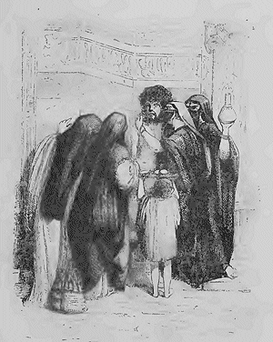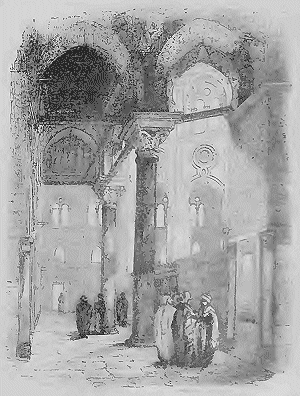 Dans la sixième livraison, M. Moreau est arrivé jusqu'il Thèbes, dont il a donné la restauration. Il a successivement représenté dans ses grandes planches coloriées: l'Aiguille et les bains de Cléopâtre, la Colonne de Pompée, un marché d'Esclaves, le Panorama du Caire, la grande Rue du Caire, la Cour d'une Mosquée, Méhémet-Ali et sa suite, le Colosse de Memphis, les Pyramides et le Sphinx de Giseh, Beni-Hassan, Syout, Melaivel-Aricli, Denderah, la salle hypostyle de Karnac, Luxor et Thèbes. Le texte qui accompagne ces beaux dessins est orné de charmantes gravures sur bois, dont nous donnons ci-dessous quelques échantillons. Nous avons choisi à dessein, outre quelques figures, deux monuments arabes extérieur et intérieur, un monument ancien ruiné et un monument ancien restauré.