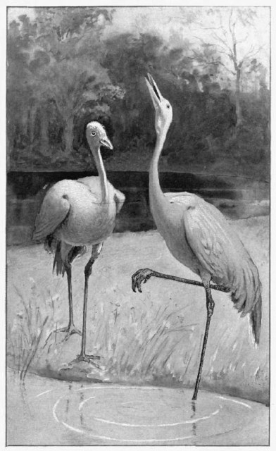 One fine day in spring, a great flock of Sand-hill Cranes came from the south. They were flying high and quietly because the weather was bright. If it had been stormy, or if they had been flying by night, as they usually did, they would have stayed nearer the ground, and their leader would have trumpeted loudly to let his followers know which way he was going. They would also have trumpeted, but more softly, to tell him that they were coming after.