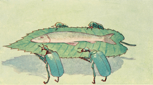 Tom walked with Chrysomela along the edge of the stubble field, down the road; that was all they knew of their direction—that they must always be going down. They expected that the way would not be long, for they remembered that, in one day, the ants had brought all their possessions from the Godmother's house to the wood. They forgot that the ants knew the direction and therefore walked straight over everything, while they, not knowing where to go, had to travel the path of the humans and therefore traveled in a wide circle.
