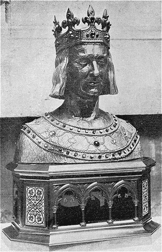 La relique de saint Louis, sa mâchoire, est exposée dans un reliquaire doré, de style gothique, tout moderne, mais surmonté d'une très belle oeuvre d'art du quatorzième siècle, l'une des plus précieuses que conserve le trésor de Notre-Dame. C'est, un buste du saint roi, le front ceint de la couronne de France, et vêtu d'un manteau fleurdelisé. La physionomie est d'un grand caractère, à la fois grave et douce et très simple.
