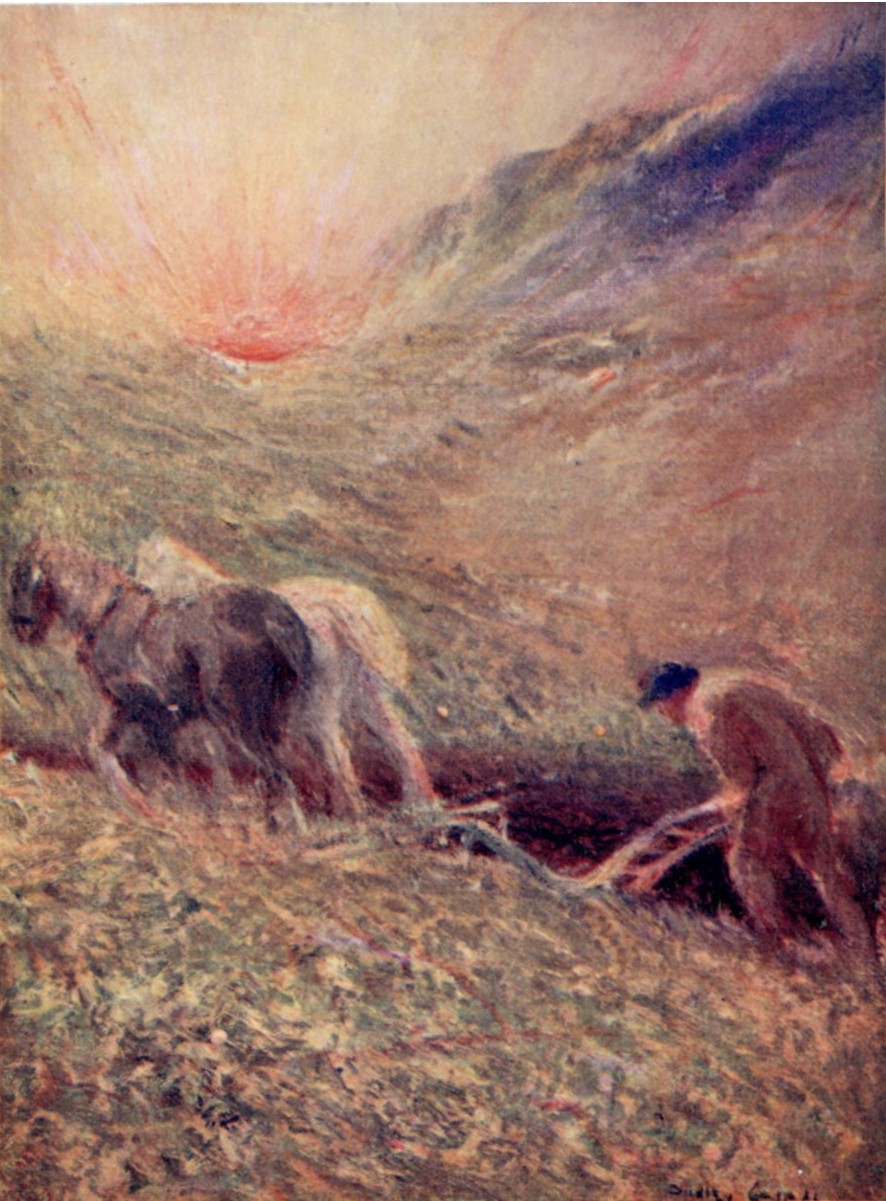 So that the man who may be seen going out this dusky morning from his little farmstead of Ellisland near Dumfries—the dark and taciturn man in hodden grey and rough top boots—is not precisely a son of the soil. He is a hard worker in the field by dint of necessity, but his strenuous and impetuous mind is set upon other thoughts than the plough, as he drives his share along the Nithsdale uplands. It is exactly the season of the year that he delights in. "There is scarcely any earthly object," he has written, "which gives me more—I do not know if I should call it pleasure, but something that exalts me, something that enraptures me—than to walk in the sheltered side of a wood or high plantation on a cloudy winter's day, and hear the stormy wind howling among the trees, or raving over the plains…. I take a peculiar pleasure in the season of winter, more than the rest of the year…. There is something that raises the mind to a serious sublimity, favourable to everything great and noble." And there is also something secretly akin to the poet's wild and passionate soul. For this is not a happy man, but an embittered one, and ready to "rail on Lady Fortune in good set terms." He takes the storm-wind for an interpreter:
