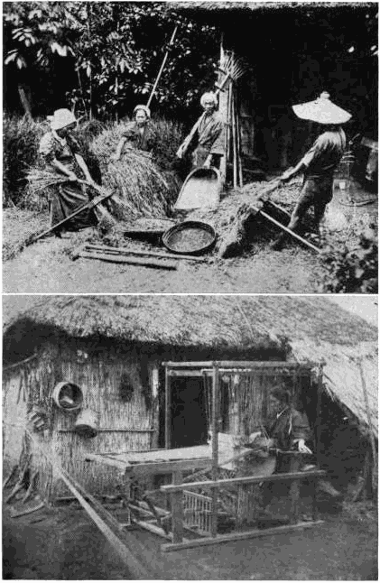 The question for us however is as to the number of girls above school age and still unmarried who, because of family poverty, must find some form of wage-earning occupation. Turning to the vital statistics provided by the government (1914), we find [Pg 26] that in 1908 there were 2,496,142 girls between ten and fifteen years of age, and 2,180,408 young women between fifteen and twenty years of age. But how many of these are married? Again relying on government statistics for the same year, we learn that only 199 girls under fifteen had been married, whereas 193,978 had married under twenty years of age. In view of the fact that 709,021 marriages took place between twenty and twenty-five years of age, it is altogether probable that, of those married under twenty, a large majority were married in their nineteenth year. Remembering that many do not marry until the twenty-third or twenty-fourth year, we can confidently assert that there are over 4,000,000 unmarried girls and young women between the ages of ten and twenty-five; and, as 58 per cent. belong to the farming class, we have in the vicinity of 3,000,000 girls who belong to families of such economic state that they, no less than the boys, must contrive in some way to earn a share at least of their own living. Girls of [Pg 27] fifteen and upwards in farmers' families help their fathers in the lighter forms of agriculture, planting the rice, as we have seen, and reaping and threshing the crops. But the small acreage to each family barely provides work enough for the man, much less for the half-grown boys and girls, hence the need of finding something besides the agricultural work for the growing family. The younger children (under fifteen) are pressed into lighter farming, and such household duties as are within their strength and ability, as cooking and caring for the still younger children; while the older children and the mother help the father, or take up some domestic industry, such as the rearing of silkworms, reeling of silk, spinning of thread, and weaving of silk and cotton fabrics, or similar work which can be easily and profitably done in the house in spare hours. Hence has come the widespread practise of household industries, by which the female members supplement the family income. There were, in 1907, 1,628,000 members of farming [Pg 28] families who were earning a part of their living in this way. This condition has prevailed for many generations, and is the secret of the wonderful development of the arts and home industries in Japan.