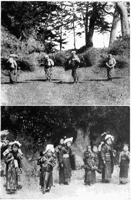 Also in the harvesting and threshing of the rice, barley, wheat, and millet, women take an important part. But it is needless to enter into details. Enough to say that, in general farming, women share with husbands and brothers the heavy toil and fatigue of agriculture. It should be added that this is not because men shirk heavy work, but only because Japanese agriculture is so largely done by hand that every possible worker is pressed into service. As a fact, men do the heaviest part of the work, preparing the soil for the successive crops and carrying the heavy loads.