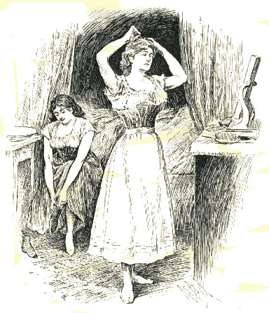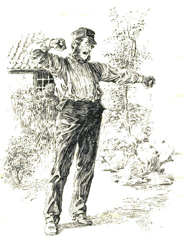 Half-dressed, he daunders out an' in,