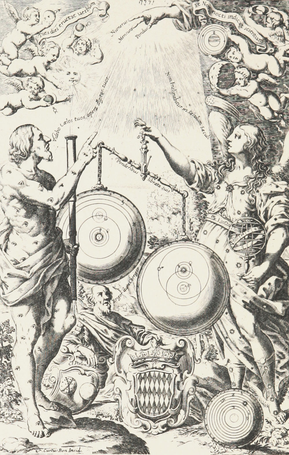 "Astrea, goddess of the heaven, wearing angel's wings and gleaming everywhere with stars, stands at the right; on the left is Argus of the hundred eyes, not tense, but indicating by the position of the telescope at his knee rather than at the eyes in his head, that while observing the work of God's hand, he appears at the same time to be worshipping as in genuflexion." (Riccioli: Alm. Nov., Præfatio, xvii). He points to the cherubs in the heavens who hold the planets, each with its zodiacal sign: above him at the top is Mars, then Mercury in its crescent form, the Sun, and Venus also in the crescent phase; on the opposite side are Saturn in its "tripartite" form (the ring explanation was yet to be given), the sphere of Jupiter encircled by its four satellites, the crescent Moon, its imperfections clearly shown, and a comet. Thus Father Riccioli summarized the astronomical knowledge of his day. The scrolls quote Psalms 19:2, "Day unto day uttereth speech and night unto night showeth knowledge."