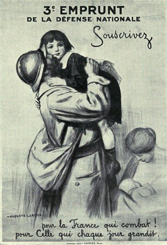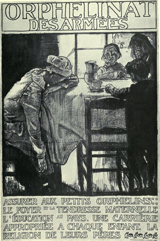 Orphelinat des Armées. (Army Orphanage). (“To ensure that the little orphans shall have a home and motherly care, education in the country, a career suited to each child, and the religion of their fathers.”) Poster for a French “Flag Day.” Issued in London.