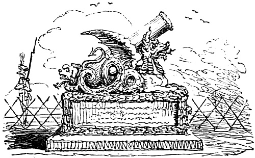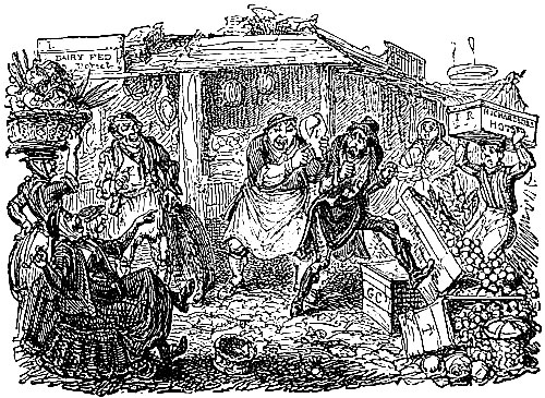 "May it please your worship," said Mr. Richard Stewart—an elderly, well-fed man, of a jolly and pleasant countenance—"May it please your worship, I keeps a stand in Covent-garden Market, and have done so any time these ten years; and Mr. Ephraim's stand is next to mine. Now, your worship, on Wednesday morning I'd a hamper o' pork up out o' Hertfordshire; and so I opened the hamper; and, at the top on it, lay a nice head; off of as sweet a pig as ever suck'd; and I takes the head, and holds it up; and, says I, 'Here's a bootiful head!' says I. 'Did ever any body see such a handsome un?'—And sure enough, your worship, it was the most bootiful as ever was; and would have done anybody's heart good to see it—it was cut so clean off the quarter (drawing his finger slowly and scientifically across the brawn of his own neck,) and was so short i' the snout, and as white as a sheet it was, your worship; [Pg 293]quite remarkable handsome. And so I said, says I, 'Look here! Did ever anybody see sich a picture?' holding it up just in this manner. With that, 'Ah!' says Mr. Ephraim, says he, 'now my dream's out—I dreamt last night that I saw two pigs' heads together, and there they are!'—meaning my head and the pig's head, your worship. Well, I took no notice o' that, but I goes me gently behind Mr. Ephraim, and slides the pig's head by the side of his head, claps my own o' the other side—all a-row—with the pig's i' the middle, your worship; and says I to the folks, says I, 'Now, who'll say which is the honestest face of the three?' With that, your worship, all the folks fell a laughing, and I goes myself quietly back again to my stall. But poor Ephraim fell in such a passion!—Lord! Lord! it were a moral to see what a pucker he were in!—he danced, and he capered, and he rubbed his whiskers—though I verily believe the pig's head never touched him—and he jumped and fidgeted about all as one as if he was mad, till at last he tumbled into the orange-chest, your worship, of his own accord, as it were; and that's the long and short of it, your worship, as my neighbours here can specify."