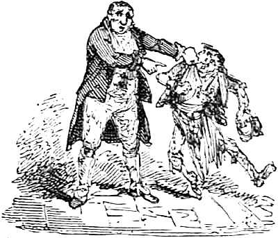 Our three prisoners strutted into the box department at the English Opera-house, on the preceding night, at half price, and half seas over—whether with cape, black strap, or blue ruin, did not appear. Two of them were particularly half seas over, viz.—Mr. Bob Briggs, and Mr. Simeon Buck;—the other, Mr. Frederic William Diggles, was but so so. They first addressed themselves to the dress circle, when Mr. Bob Briggs, a slight-made, half-grown, flaxen-haired youth, instead of waiting for the box-keeper to open the door of the box in which he wished to make his début, set about kicking it with all his might. What gentleman of spirit would waste his breath in bawling for a box-keeper, when his own foot, well applied to the door, must inevitably compel the "spooneys" within to open it?—And so it turned out; some of the quiet ones within, hearing such a magnificent thundering, did open it; and Mr. Bob Briggs was just setting himself to make his entrée, room or no room, when one of the box-keepers came up and assured him the box was full, at the same time endeavouring to close[Pg 300] the door again. "What d'ye mean by that, ye rascal!" cried Mr. Bob Briggs, "is that the way to treat a gentleman?" "Sir," said the box-keeper, "I mean no offence, and if you will walk this way I will endeavour to find you a seat upstairs." "Up stairs be d——d!" retorted Mr. Bob Briggs, "I shall go in here, come what come may, as old what's his name says; so come along, Sim Buck!—Hiccup." They instantly tried to force themselves into the box; the box-keeper and the company tried to keep them out; the constable was called; and, with some ado, he prevailed upon them to relinquish their attempt upon that particular box. But Mr. Constable had scarcely let them go, when the hubbub was renewed; and turning back, he found they had got the box-keeper up in a corner, and were trying, as he said, "to squeeze their money out of him;"—for they had made up their minds to stick to the dress circle, and since there was no room for them in the dress circle, they insisted upon having their half-crowns back again—"so fork out the blunt, you little rascal!" There was a great row; the entrance to the lobby was blocked up; the constable again interfered: Mr. Simeon Buck collared the constable; the constable collared Mr. Simeon Buck; Mr. Frederic W. Diggles caught hold of Mr.[Pg 301] Simeon Buck's coat tail, and tried to pull him away from the constable; the constable only held him the faster, determined to send him to the watch-house; and there was poor Mr. Simeon Buck, see-sawing backwards and forwards, with the constable pulling away at his neck, and Mr. Frederic W. Diggles at his tail, for nearly ten minutes; whilst Mr. Bobby popped about the lobby like a pea upon a tobacco-pipe; squeaking for help, and wishing all contumacious constables, and "blackguard box-keepers," at the very diable! At length the constable prevailed, and Mr. Simeon Buck, half-strangled, and sadly damaged in his cravattery, was led away to the watch-house, followed by Mr. Bob Briggs, and Mr. Frederic W. Diggles; and there all three were safely stowed away for the night.