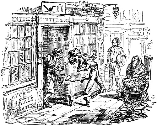 "May it please your worship," said Mrs. Penelope Roebuck, wiping her comely cheeks and bruised eye with a lavender-scented cambric handkerchief—"May it please your worship, I am Mrs. Roebuck, the wife of Mr. Roebuck, of Somers Town; and yesterday I walked all the way from Chelsea, which very much fatigued me, as your worship may suppose; and being fatigued, I went into Mr. Clancey's, for I had always understood Mr. Clancey to be a mighty nice sort of a man. 'And pray,[Pg 287] Mr. Clancey,' said I, 'would you have the goodness to make me sixpenn'orth of brandy and water, warm, with a little sugar in it?' 'No, mem,' said he, 'it is not in my power to make sixpenn'orth of brandy and water—the dooties are so high; but you may have eightpenn'orth. 'Very well,' says I, 'it's quite himmyterul; make me eightpenn'orth.' With that, your worship, he made me a very nice glass of brandy and water, and I sat myself down to take it by little and little; for I'm not a person what's given to take my liquor by lumps; but I had scarcely wetted my lips, when he took a very improper liberty—such a liberty, your worship, as I suffers no man to take with me, be he whomsoever he may; and, 'Mr. Clancey,' says I, 'I shouldn't have thought of it from such a fellur as you.' I might have said something else, your worship, but that's neither here nor there; Mr. Clancey, without saying another word, good, bad, nor indifferent, had the goodness to come out of his bar, and, turning my two hands behind my back, he conducted me out of the house, and had the goodness to fling me down on the hard pavement!—by which purlite behaviour my eye was blacked, as you see, and my dress, worth at least five pounds, completely remollished.