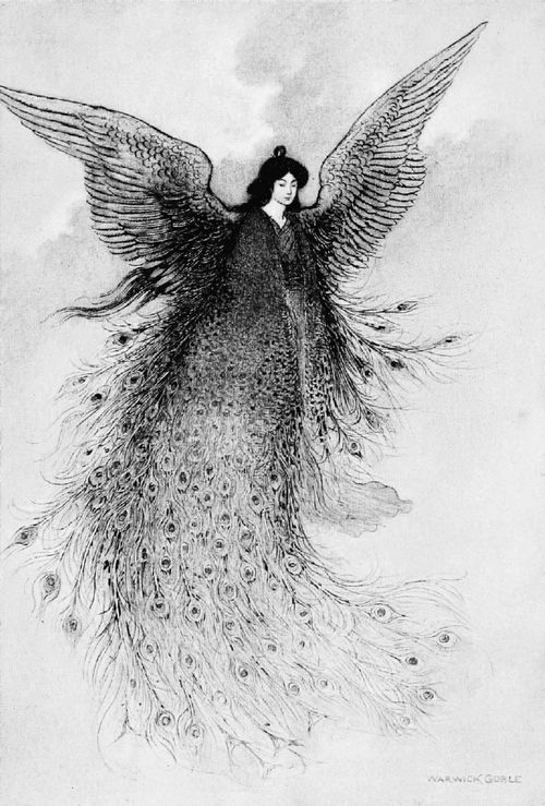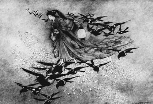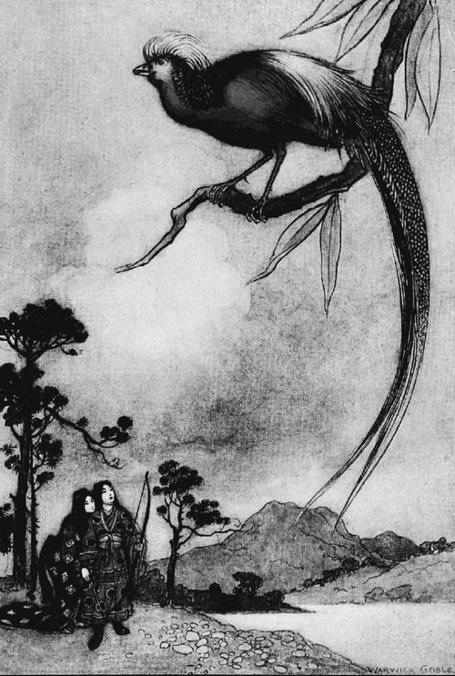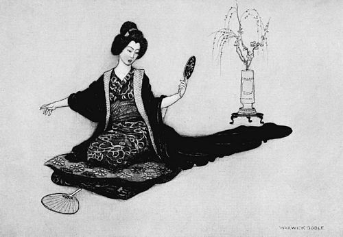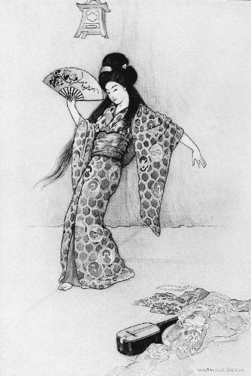 And when the nine years were past he was in his garden upon the Night of Souls. And looking up he saw a woman that came towards him, threading her way through the paths of the garden. Lightly she came; she was a slender girl, dressed in a simple gown of blue cotton. Tatewaki stood up and spoke: