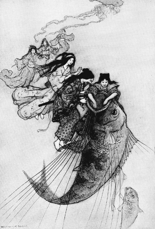 “The plains,” he said, “the low plains ... there will I find her.” So, with the golden token wound about his arm, fleetly he sped down, down to the plains. He came to the broad river, where he saw folk standing on the green banks. And on the river there floated boats of fresh flowers, the red dianthus and the campanula, golden rod and meadow-sweet. And the people upon the river banks called to Tatewaki: