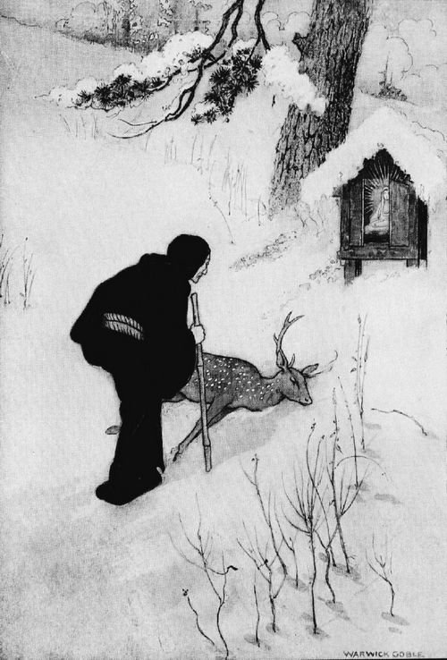 “Come in, come in, young sir!” cried the old woman, full of pity. “Come in to the warm fire. You are very welcome. We have but coarse fare to offer, but it shall be set before you with great good-will. As to your horse, I see you have[4] delivered him to my daughter; he is in good hands.”