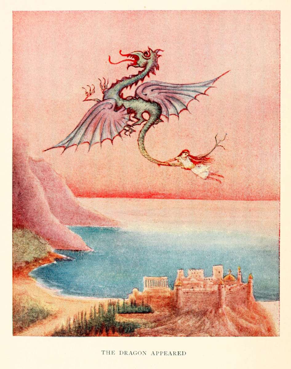 [235]There was once upon a time a King who had three sons and one daughter. Not far from the King's palace there was a large garden, and in this garden lived a dragon. The King told his children never to go into the garden lest they should be caught by the dragon, which had wings. But one evening the youngest of the King's sons, whose name was Orestes, went with his sister into the garden and began to play. No sooner had they begun to play than the dragon appeared, and seizing the little Princess with its tail, flew away into the air and took her to a high mountain which no one could climb.