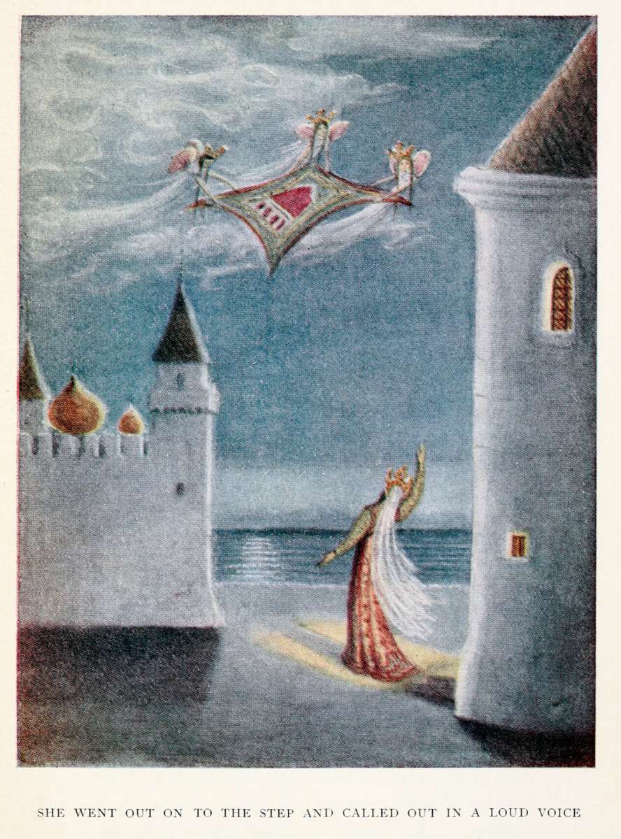 She put him to bed, and threw off her frog's skin, and turned into a beautiful maiden. She went out on to the steps and called out in a loud voice: "Oh, you boisterous winds, bring hither that same carpet on which I used to sit in the house of my father."