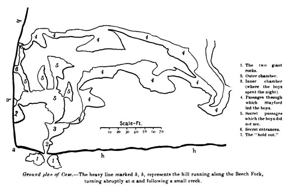 He would see that very day whether it could be found. To the cave he went, the manuscript in hand, and with him John Finn, a companion, who shared with him his sports. What appeared to be the sunken roof of the cave was easily traced. In fact it was familiar to the boys as they had often hunted rabbits there in the thick hazel and sassafras bushes. The day passed by and the "holdout" was not found. The boys did not grow disheartened. They returned to the spot with a rope ladder; with this they could descend safely and examine the precipice by sections.