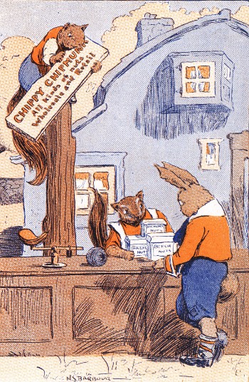 Chippy Chipmunk stood outside his store waiting for Little Jack Rabbit to come along. He had promised, if the little bunny would call after business hours, to help him get a little store of his own.